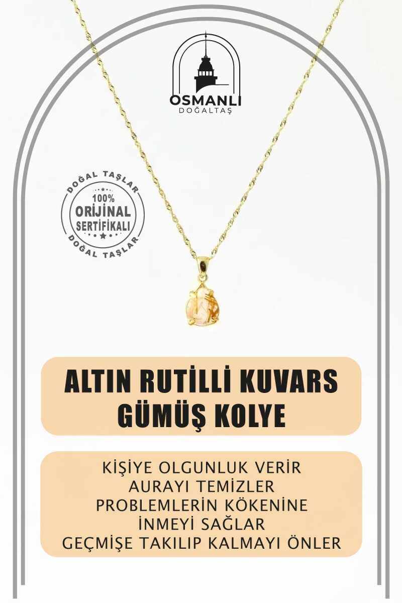 Altın Rutilli Kuvars Doğal Taş Kolye, Gümüş Sarı Zincir