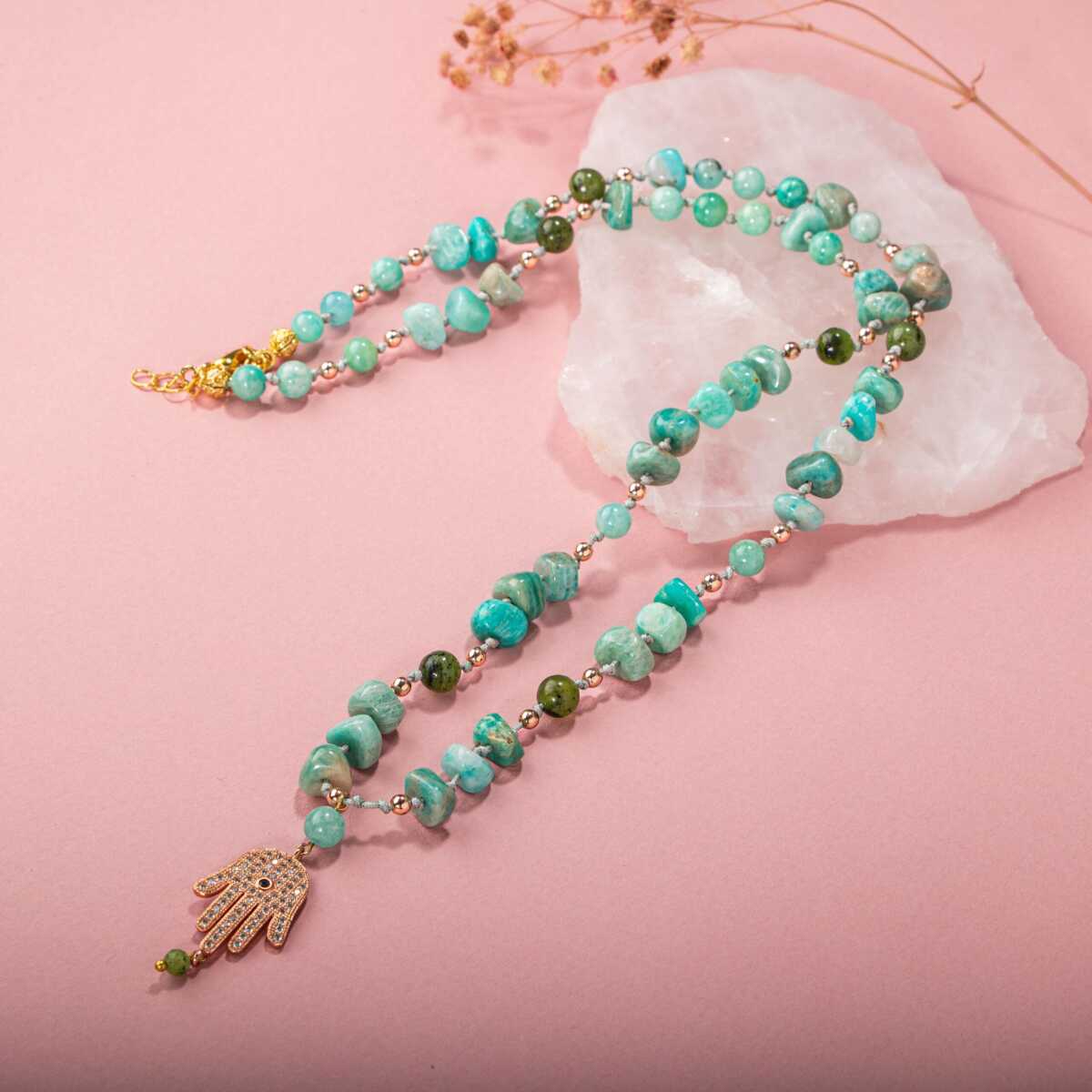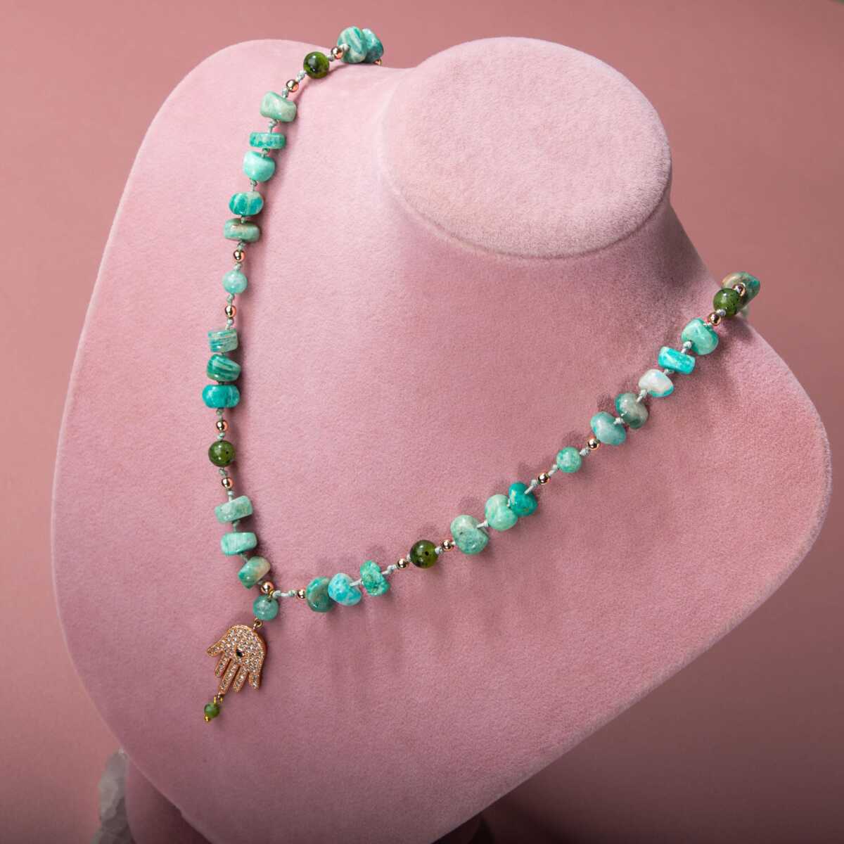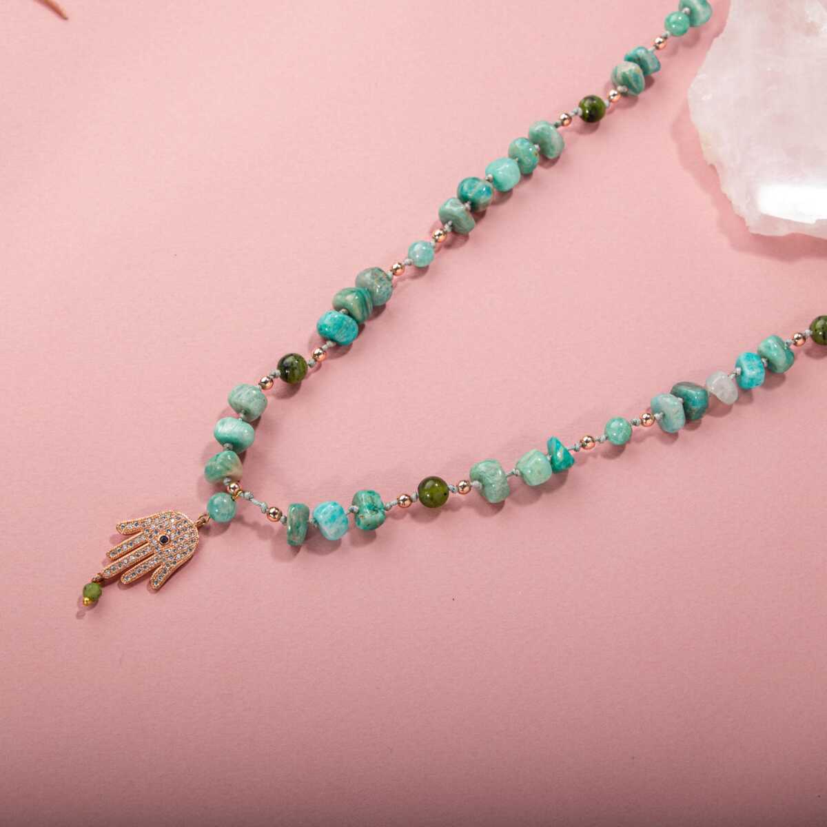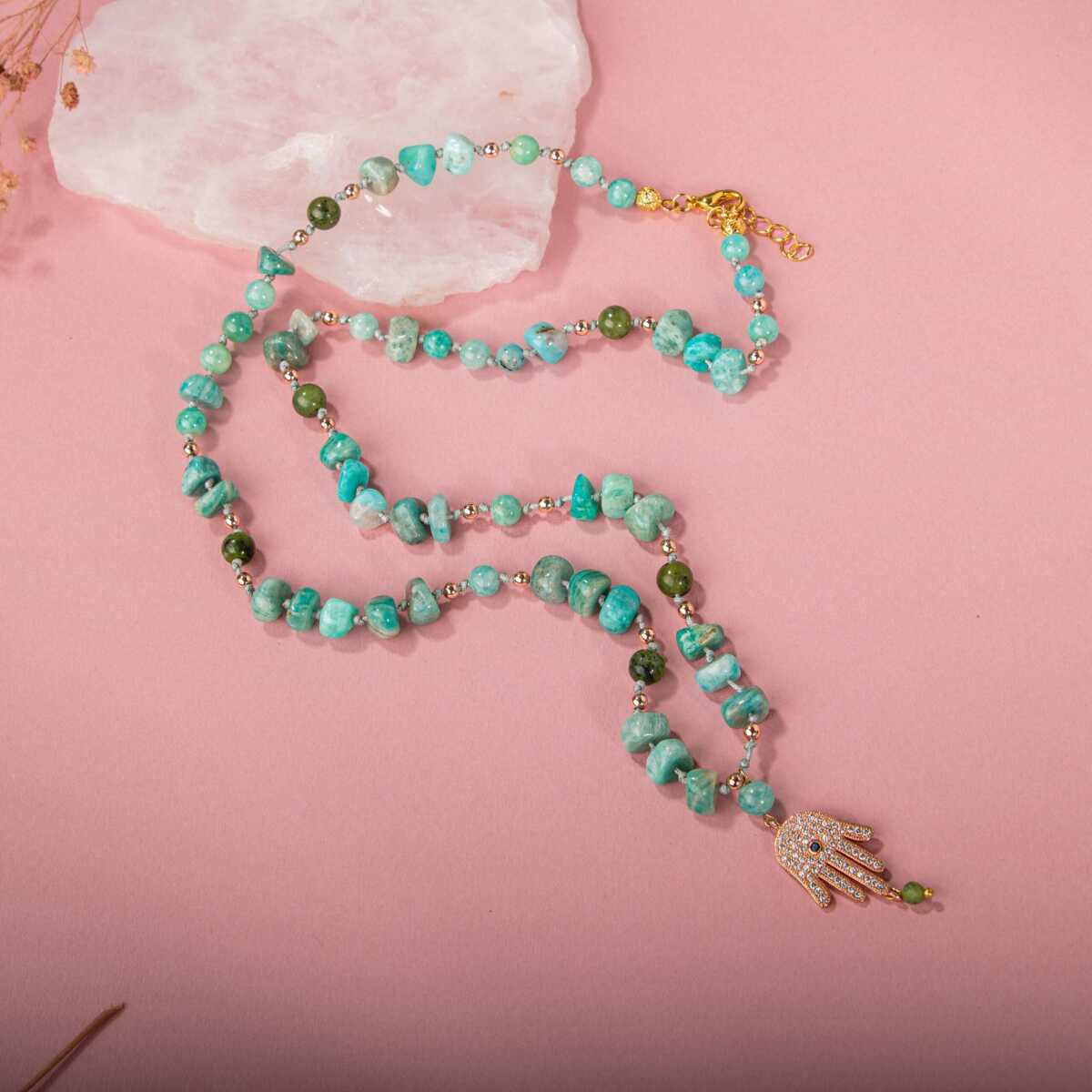 Amazonit-Yeşim Doğal Taş Hamsa Fatıma Eli Altın Kaplama Kolye