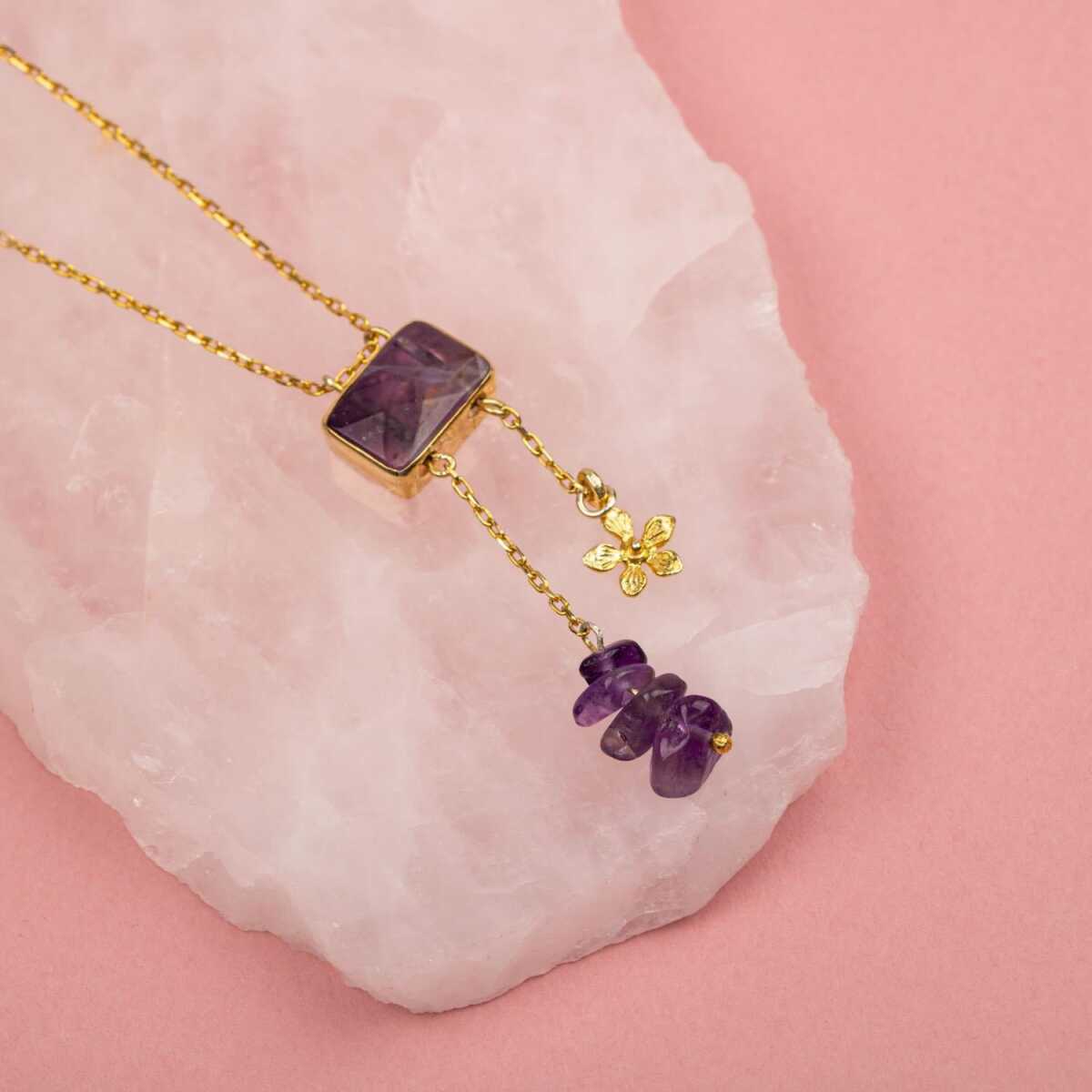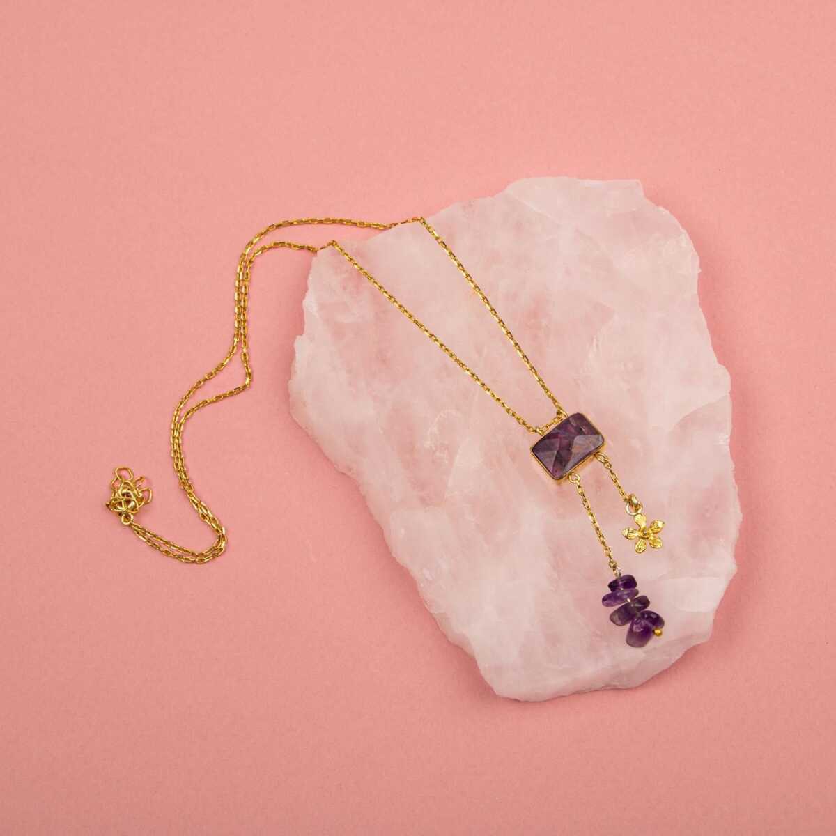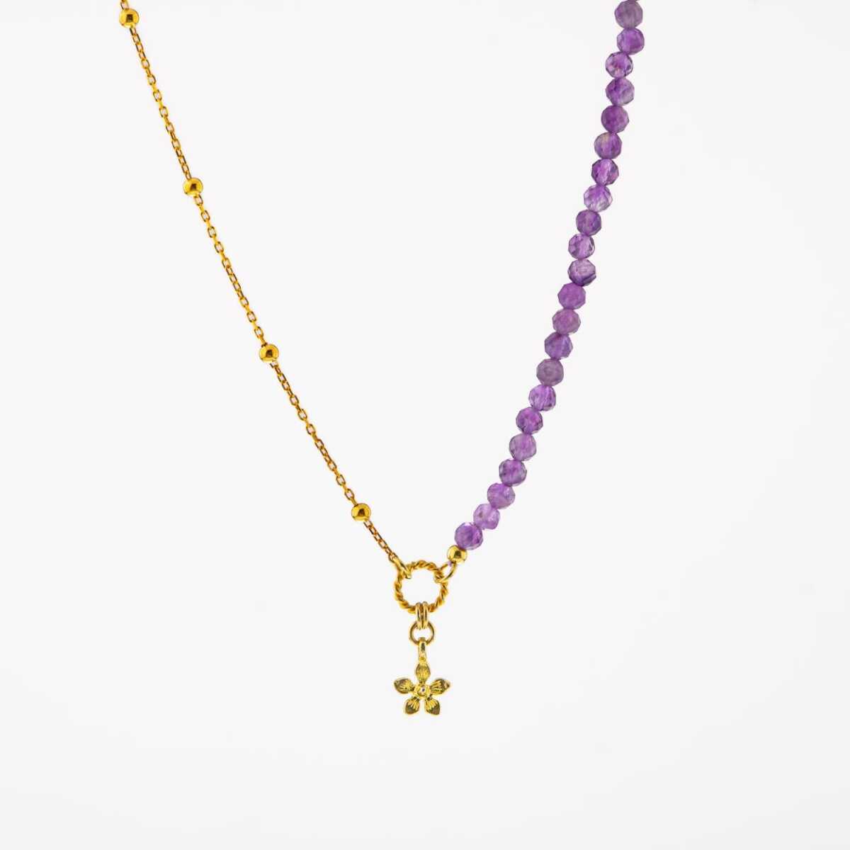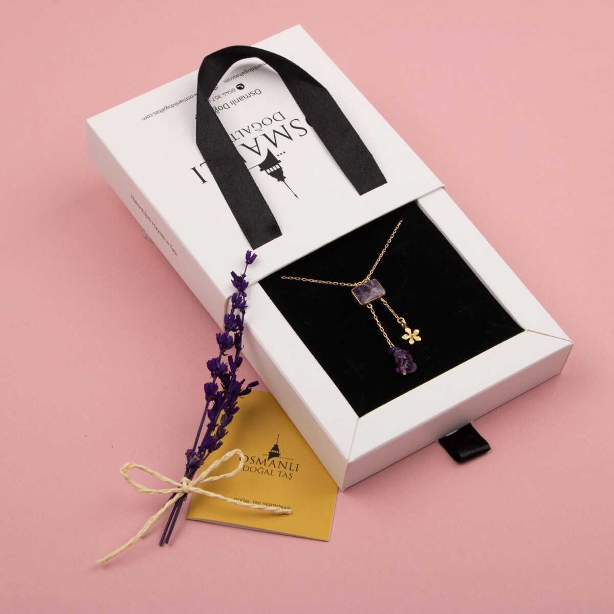 Ametist Doğal Taş Gümüş Çiçekli Kolye