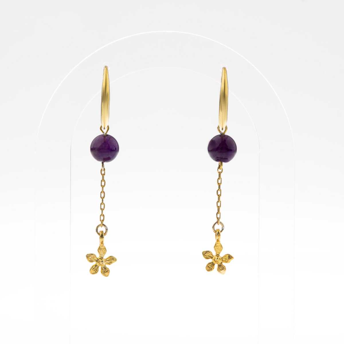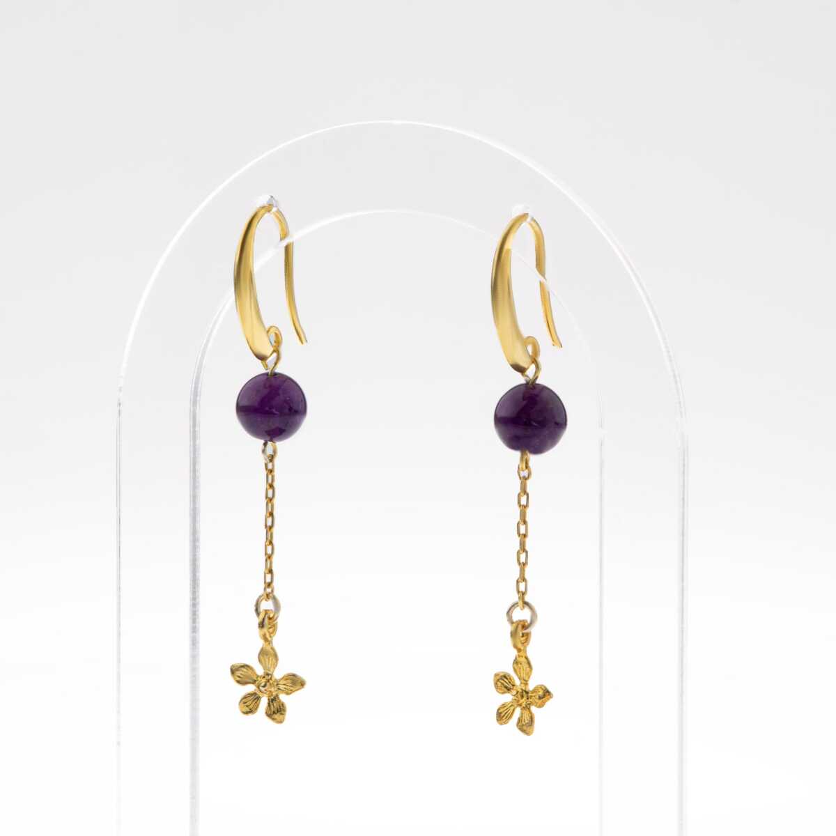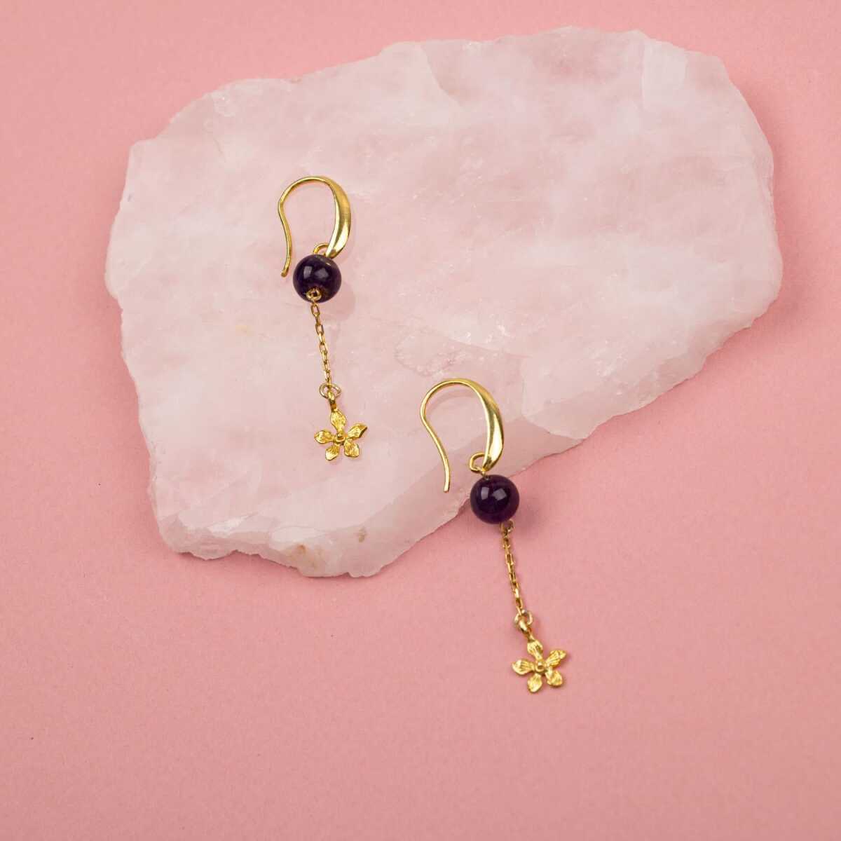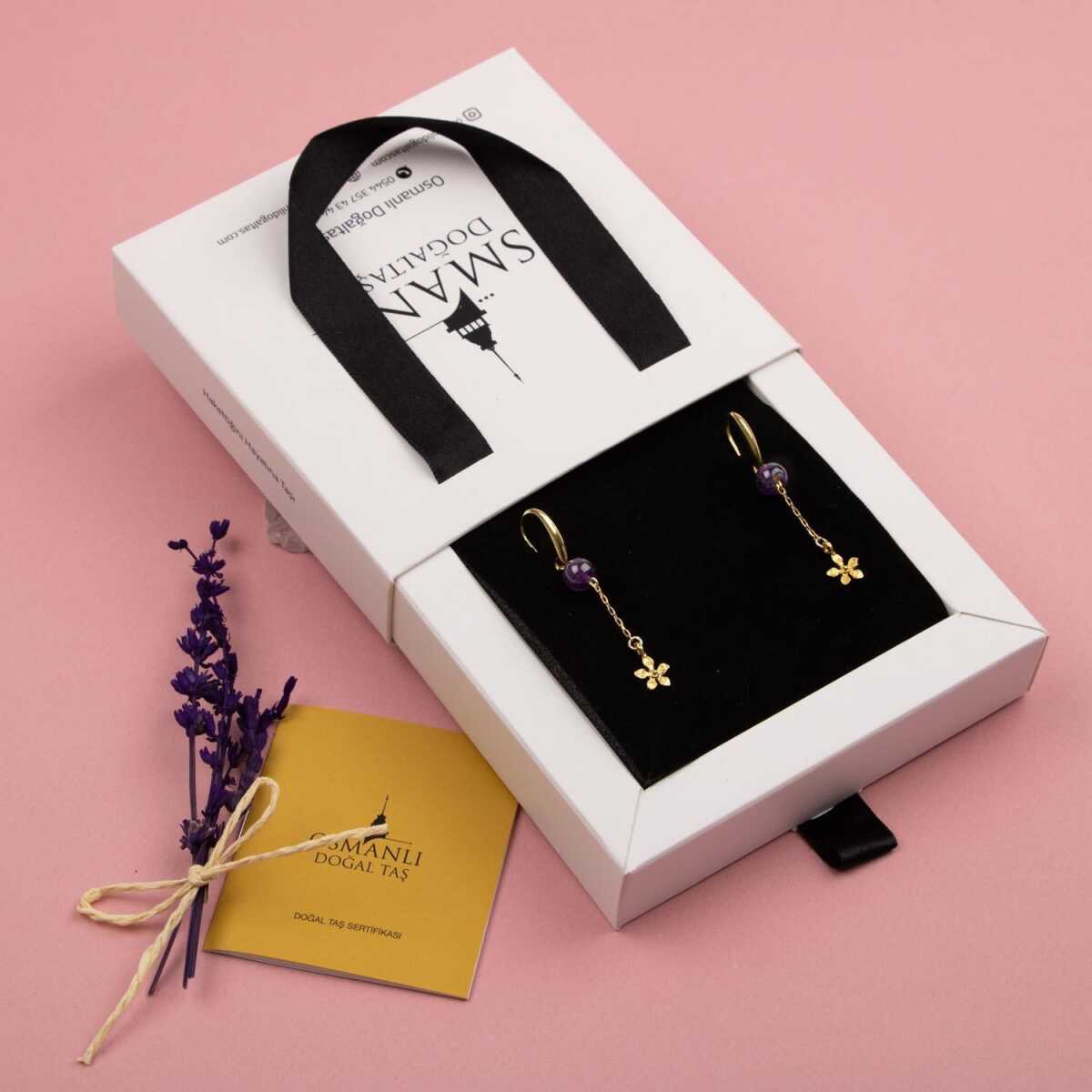 Ametist Doğal Taş Gümüş Çiçekli Küpe