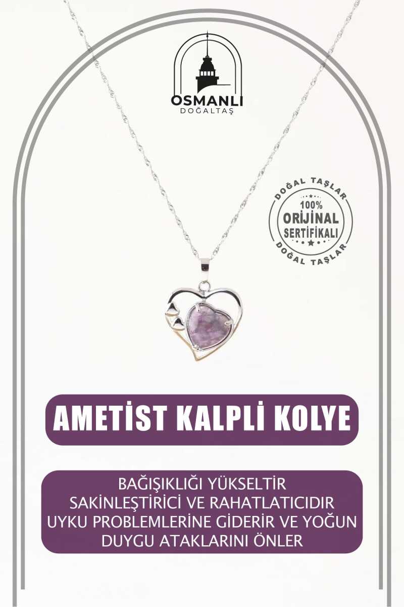 Ametist Doğal Taş Kalpli Kolye, Gümüş Zincir