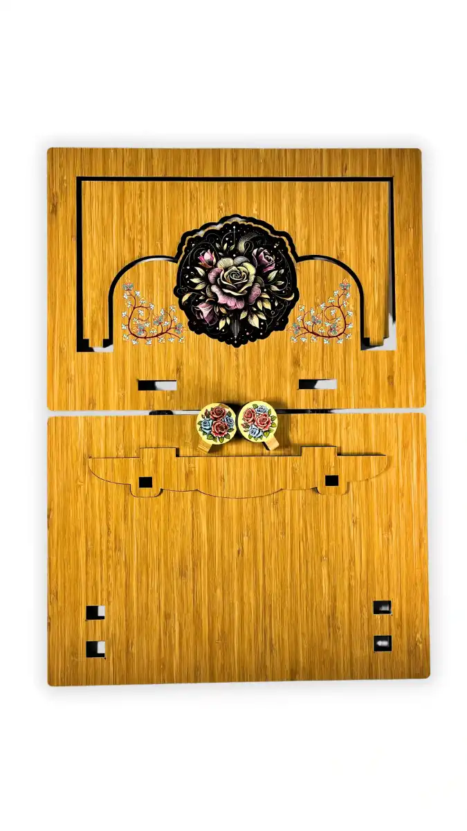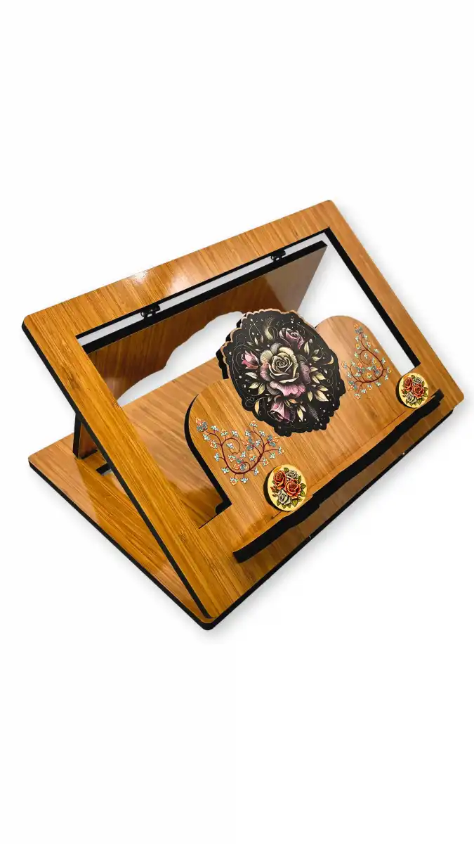 Masaüstü Ahşap Kitap Okuma Rahlesi, 32x23 cm ölçülerinde ve 8 mm kalınlığında, masa üstünde kullanım için tasarlanmış şık bir üründür. UV baskı ile çiçek desenleriyle süslenmiş olan bu rahle, hem estetik hem de fonksiyonel bir deneyim sunacaktır.
