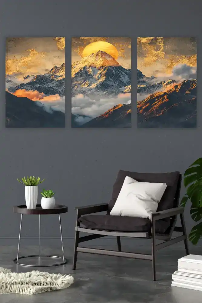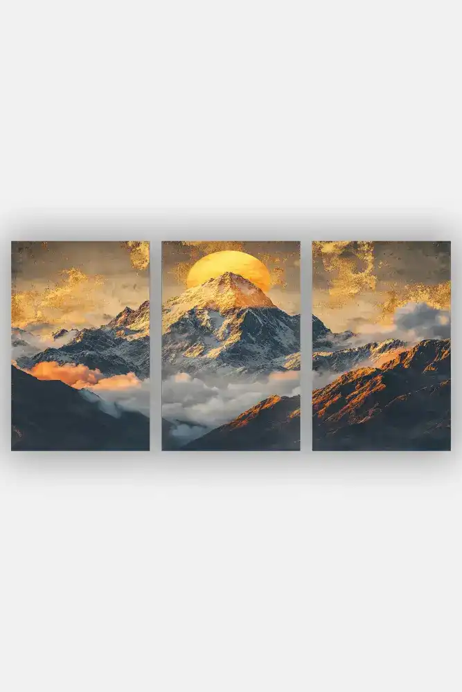 Set İçeriği: 3 adet tablo (dağ ve güneş manzaralı tasarım)
