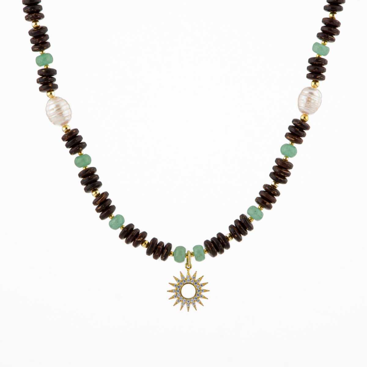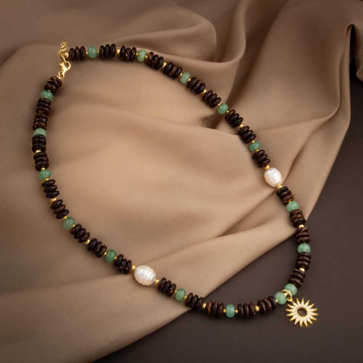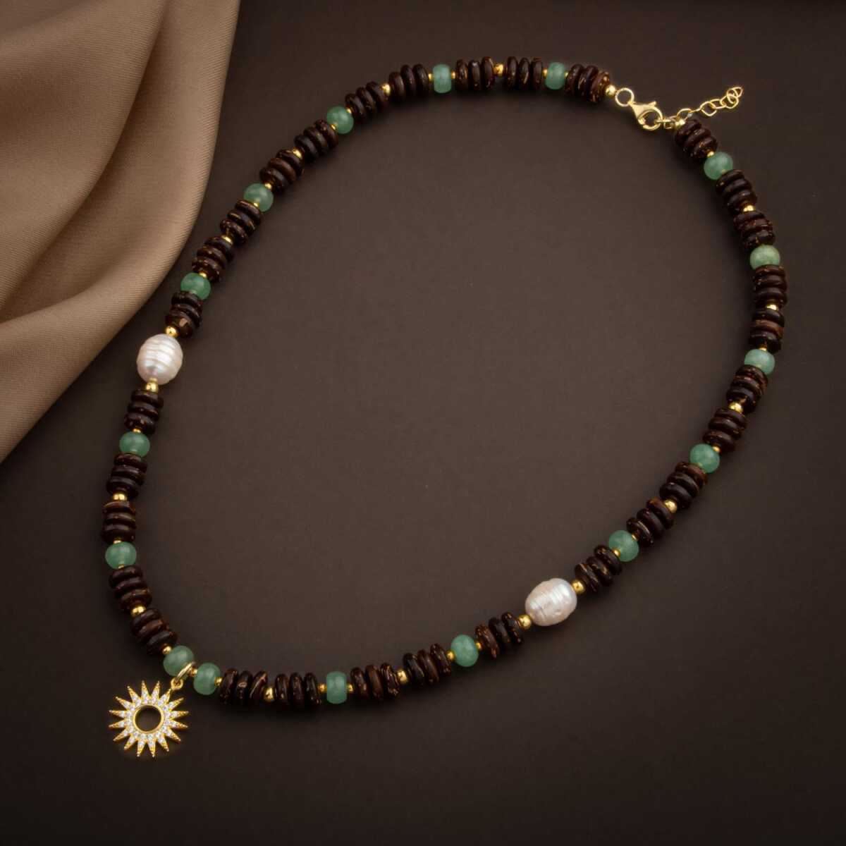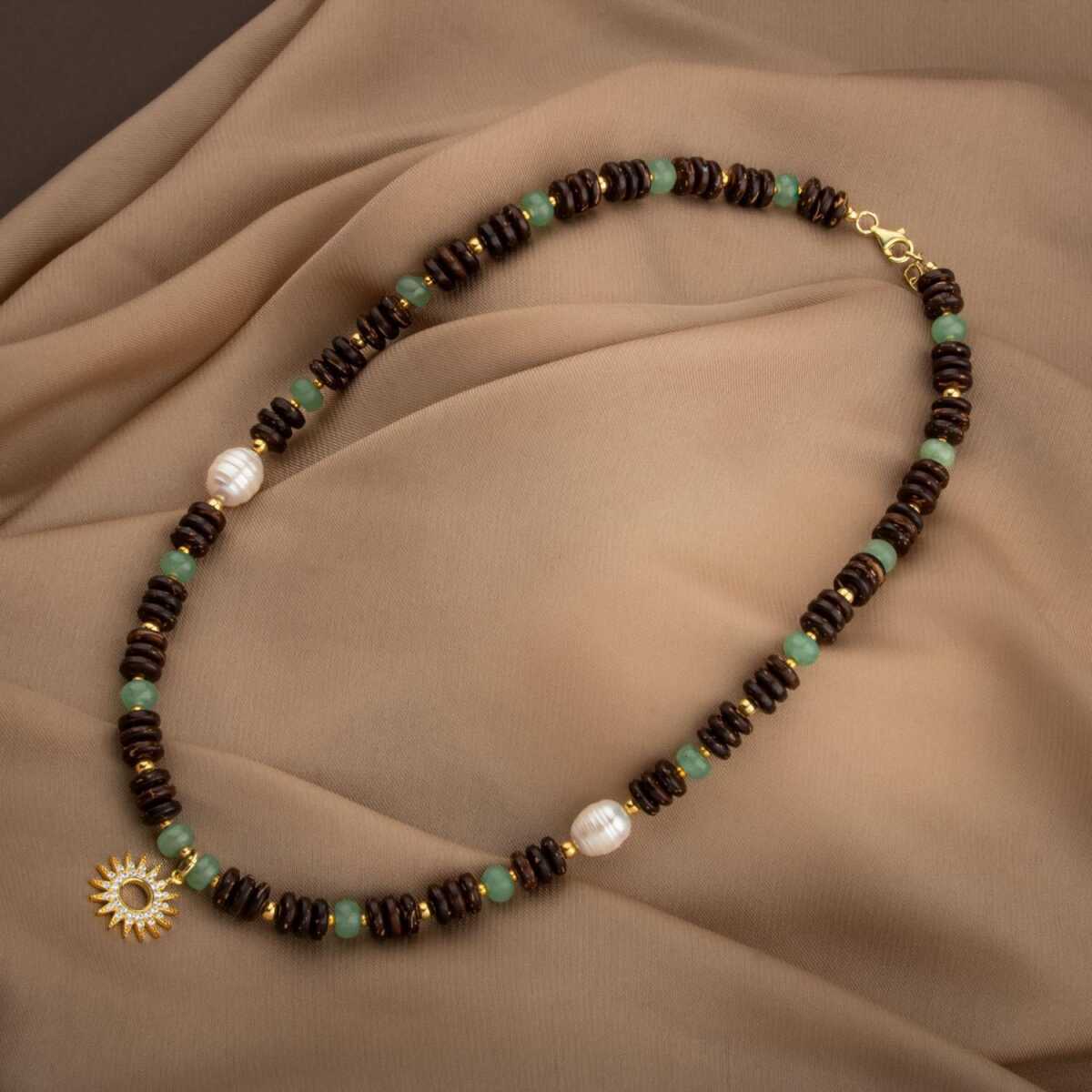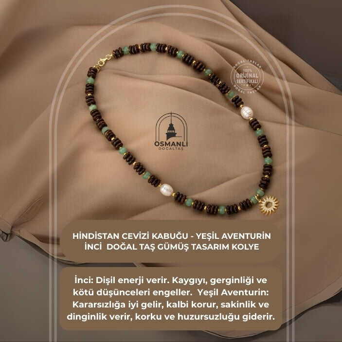 Hindistan Cevizi Kabuğu-Yeşil Aventurin-İnci Doğal Taş Gümüş Tasarım Kolye - 54cm