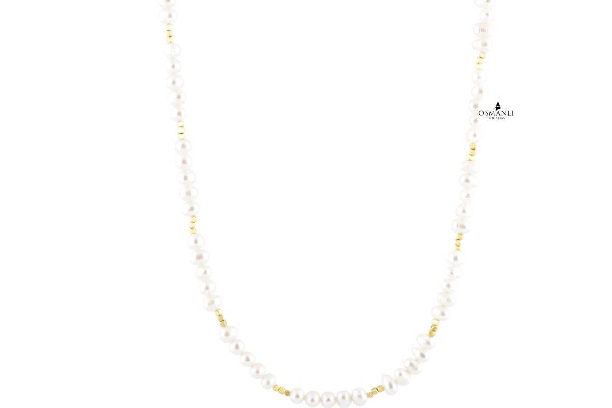 İnci Doğal Taş Gümüş Tasarım Zincir Kolye - 50cm