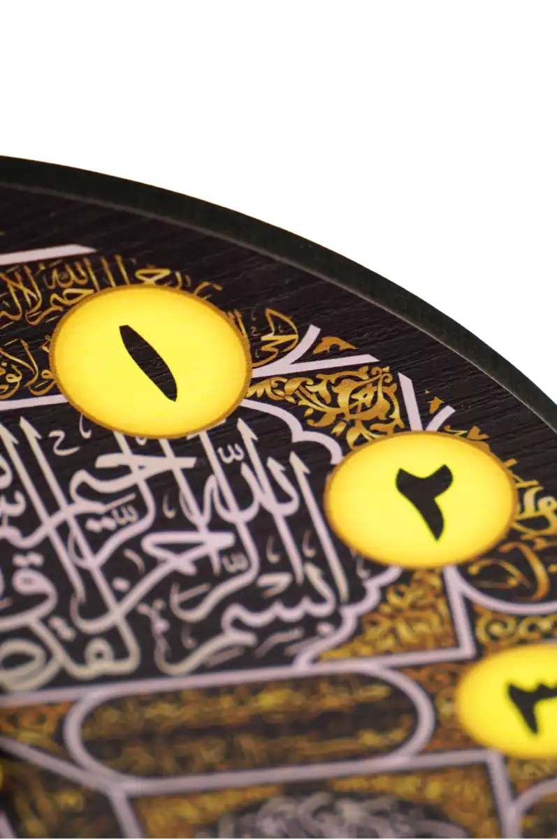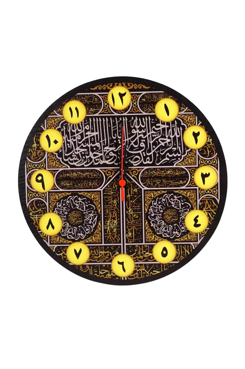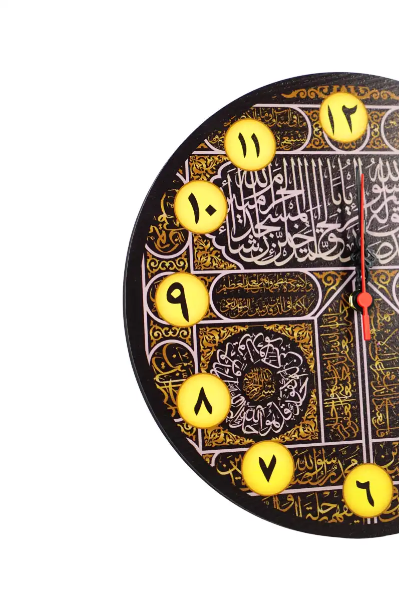 Kâbe’nin mübarek kapı örtüsü tasarımından ilham alınarak hazırlanmış bu özel duvar saati, bulunduğu ortama manevi bir huzur ve vakar katar. Siyah ve altın tonlarının klasik uyumu, Arapça hat yazılarının zarafeti ve sembolik tasarım öğeleri ile dikkat çeker.