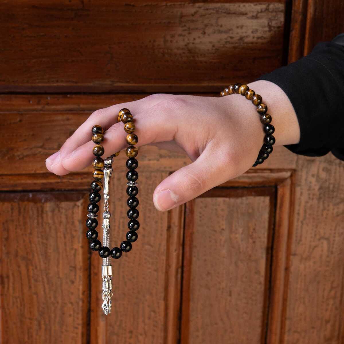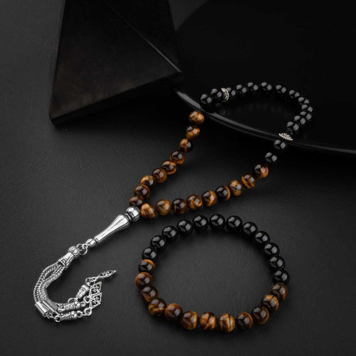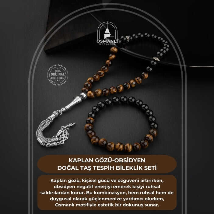 Kaplan Gözü-Obsidyen Doğal Taş Tesbih Bileklik Seti