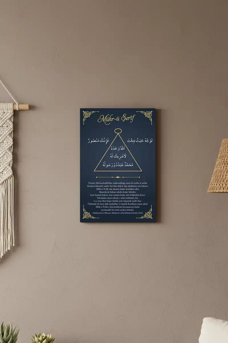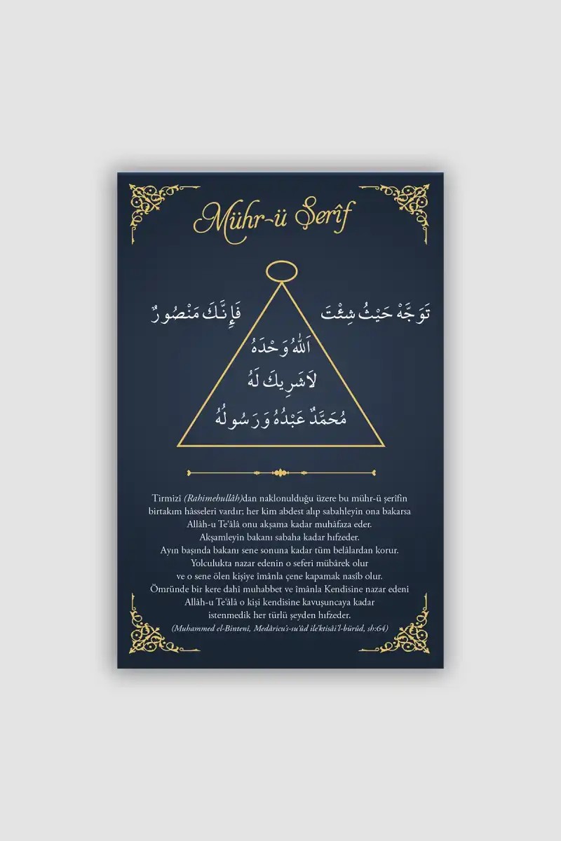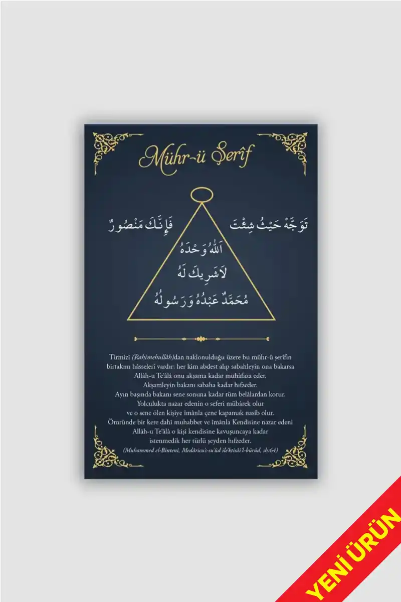 Mührü Şerif; Resûlullah ﷺ’yi hatırlatan, kalbi O’na yönelten ve gönülde salavatı çoğaltan kıymetli bir semboldür. Ona bakıldığında, müminin kalbinde Peygamber Efendimiz ﷺ’ye karşı duyulan sevgi tazelenir, edep ve bağlılık hissi güçlenir.
