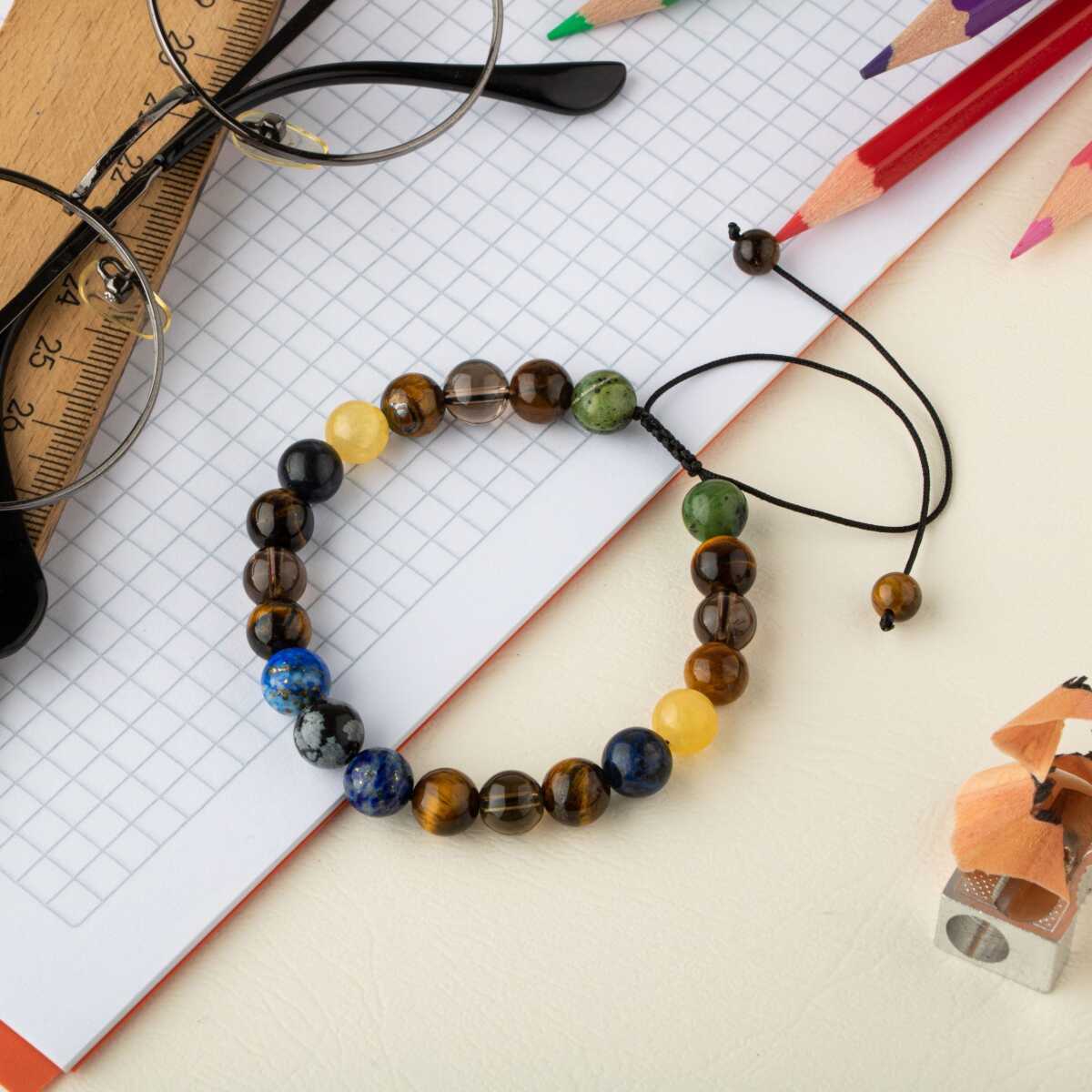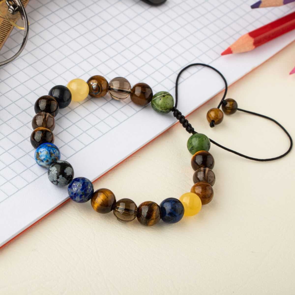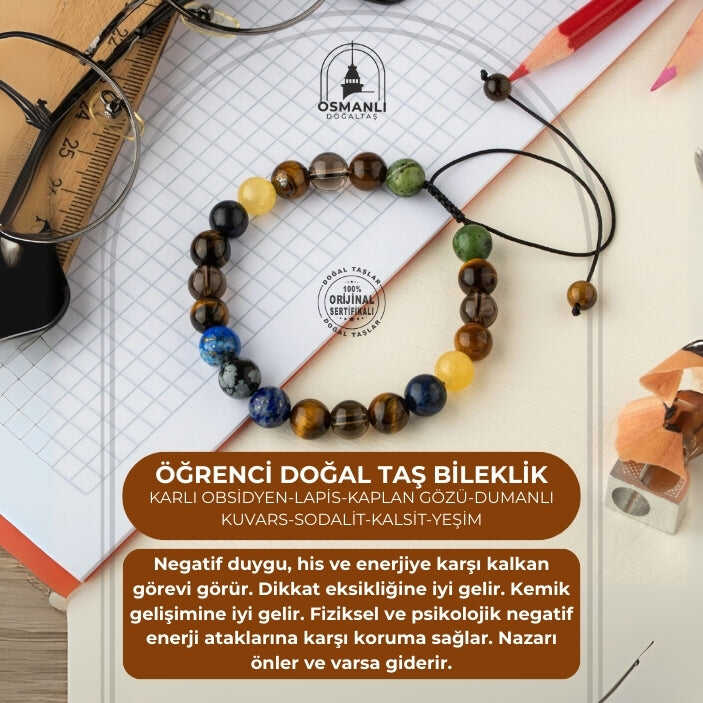 Öğrenci Doğal Taş Bileklik-Karlı Obsidyen-Lapis-Kaplan Gözü-Dumanlı Kuvars-Sodalit-Kalsit-Yeşim