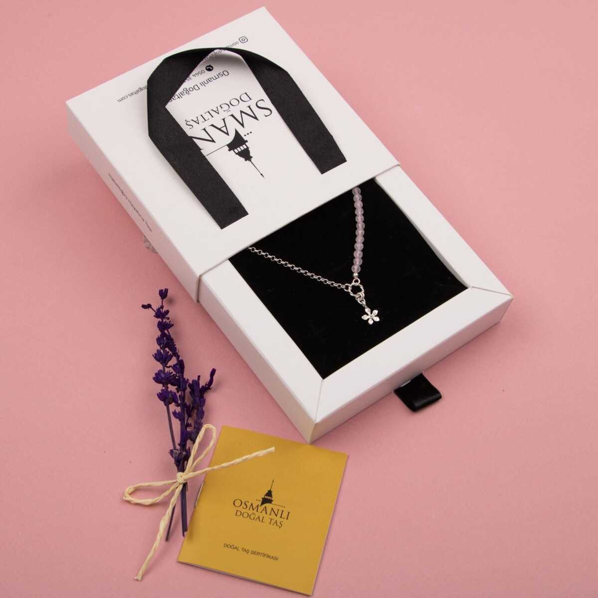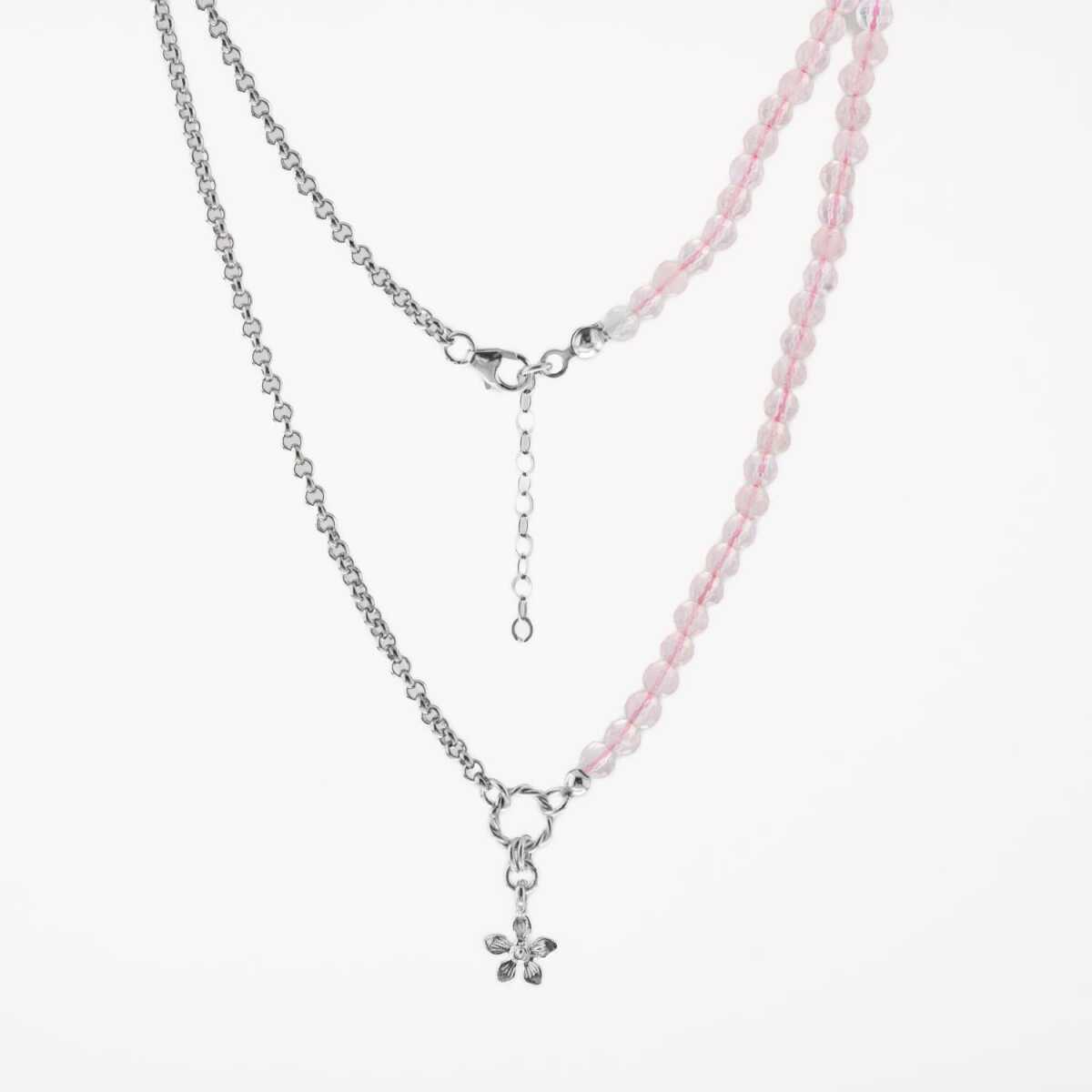 Pembe Kuvars Doğal Taş Gümüş Çiçekli Kolye - 50cm