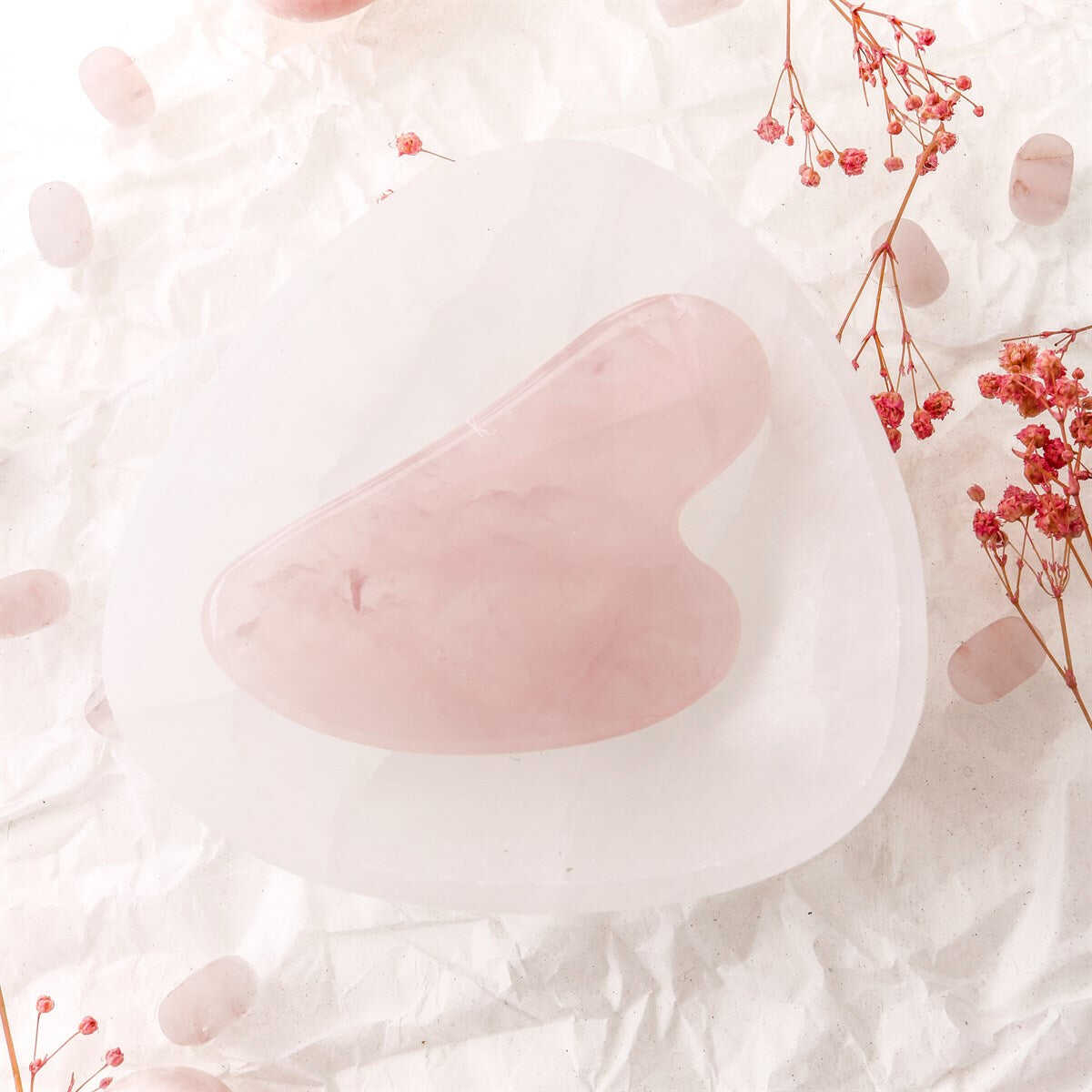 Pembe Kuvars Taşı Masaj Takımı - Roller ve Gua Sha Kalpli Set