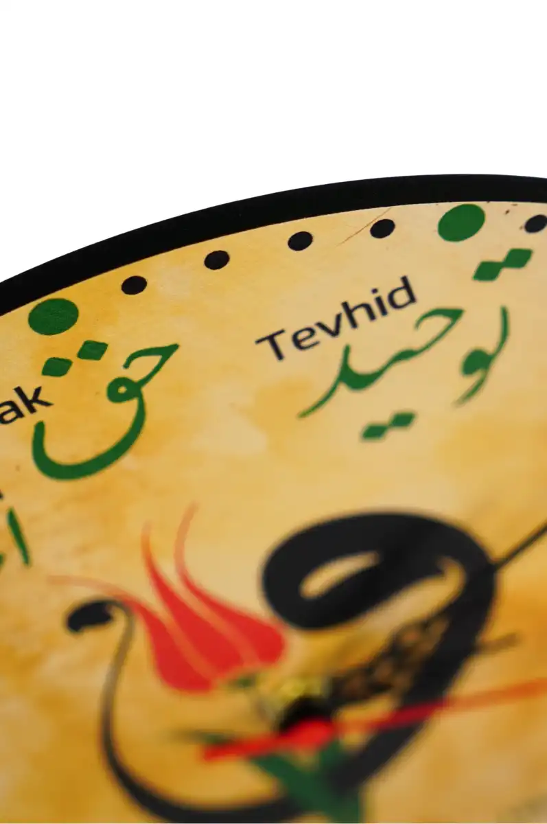 Merkezi süsleyen, derin anlamlar taşıyan "Vav" harfi ve geleneksel Türk-İslam sanatının en zarif motifi olan Lale figürü, saatinizi sıradan bir eşyadan, ruhunuzu besleyen bir sanat eserine dönüştürür.