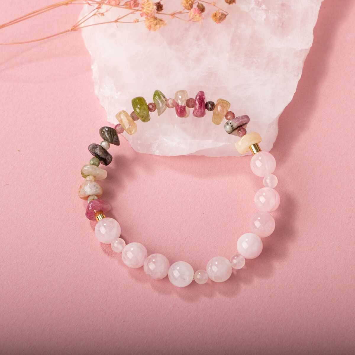 Renkli Turmalin-Pembe Kuvars Doğal Taş Bileklik