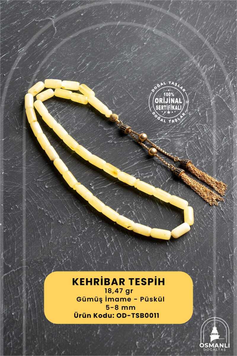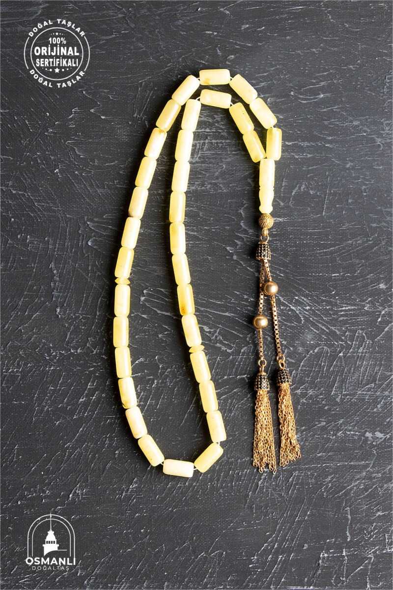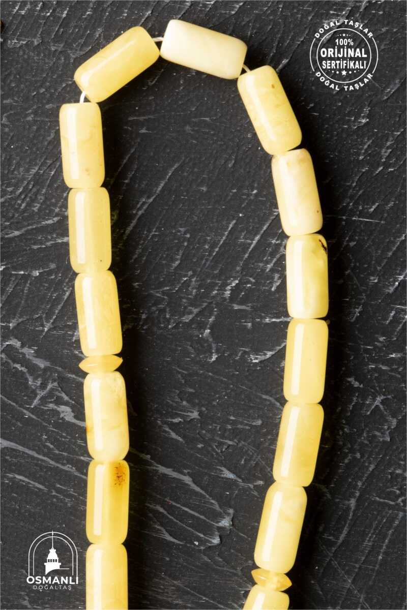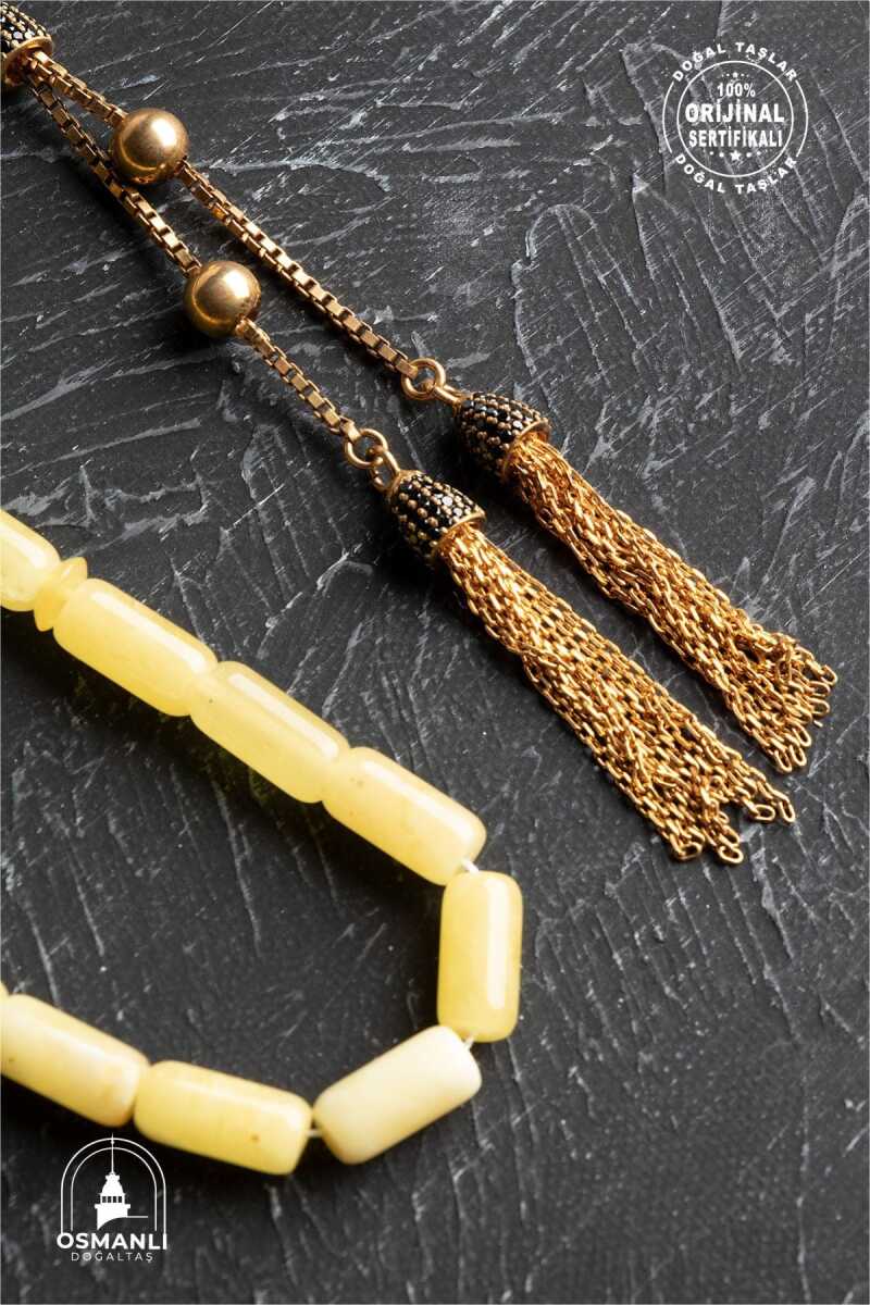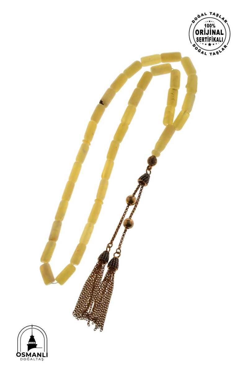 Sertifikalı 5-10 mm Silindir Kesim Gold Eskitme Kaplamalı Gümüş İmame ve Püsküllü Kehribar Tesbih - 18,47 gr