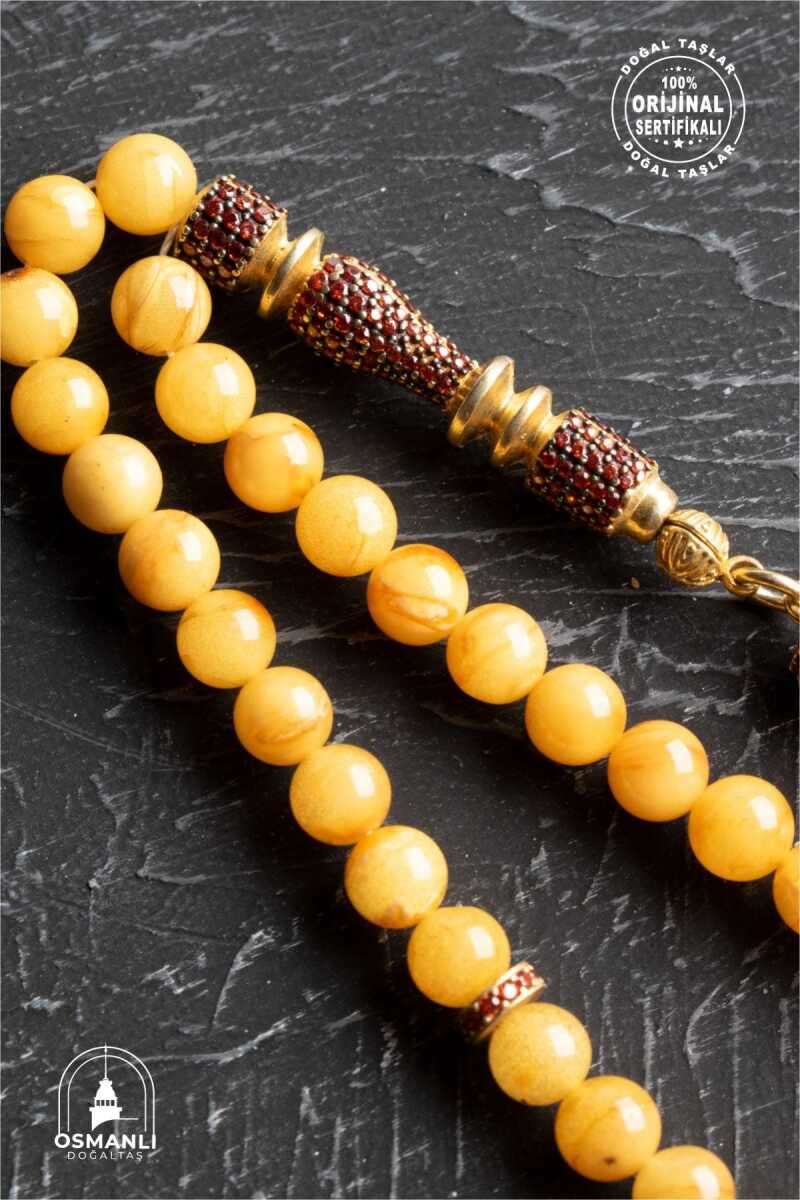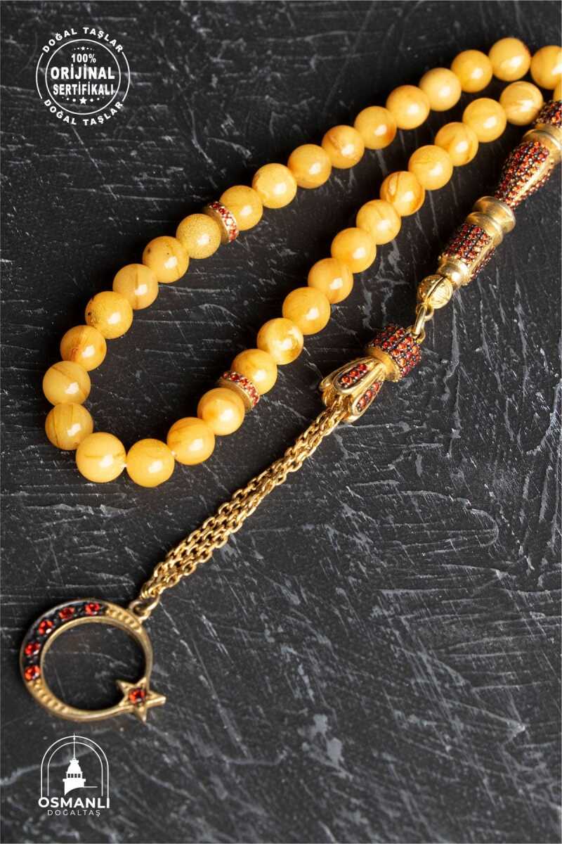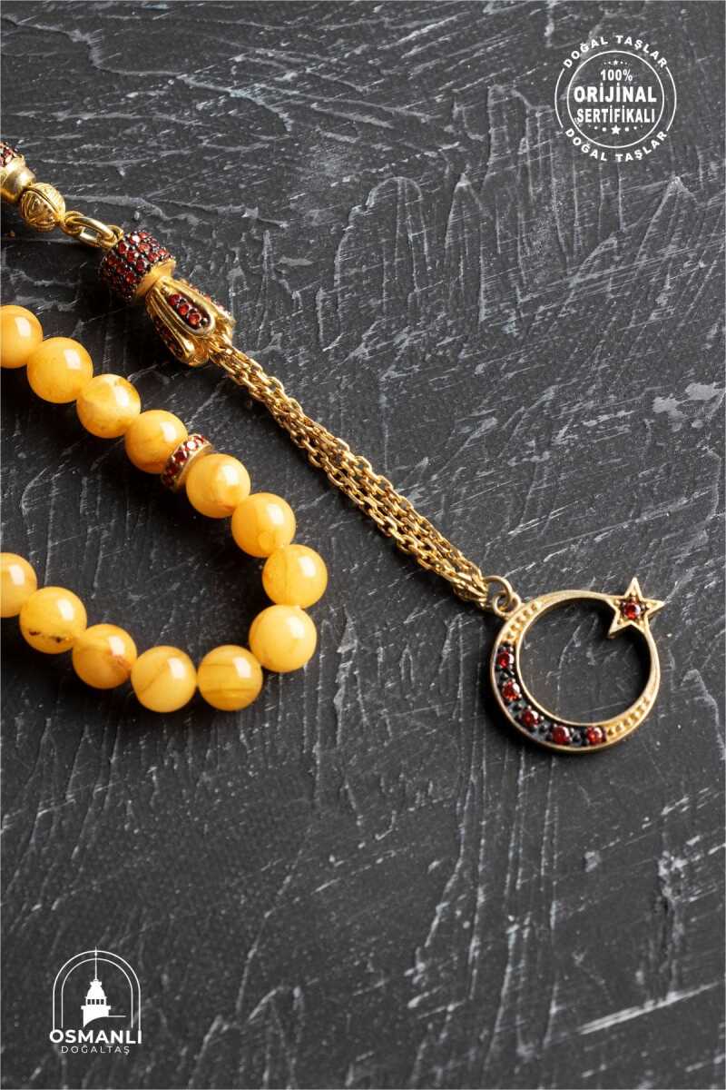 Sertifikalı 6 mm Küre Kesim Gold Kaplama Gümüş Ay Yıldızlı Kehribar Tesbih