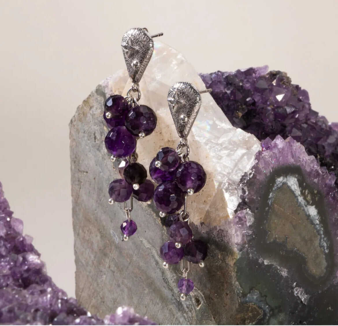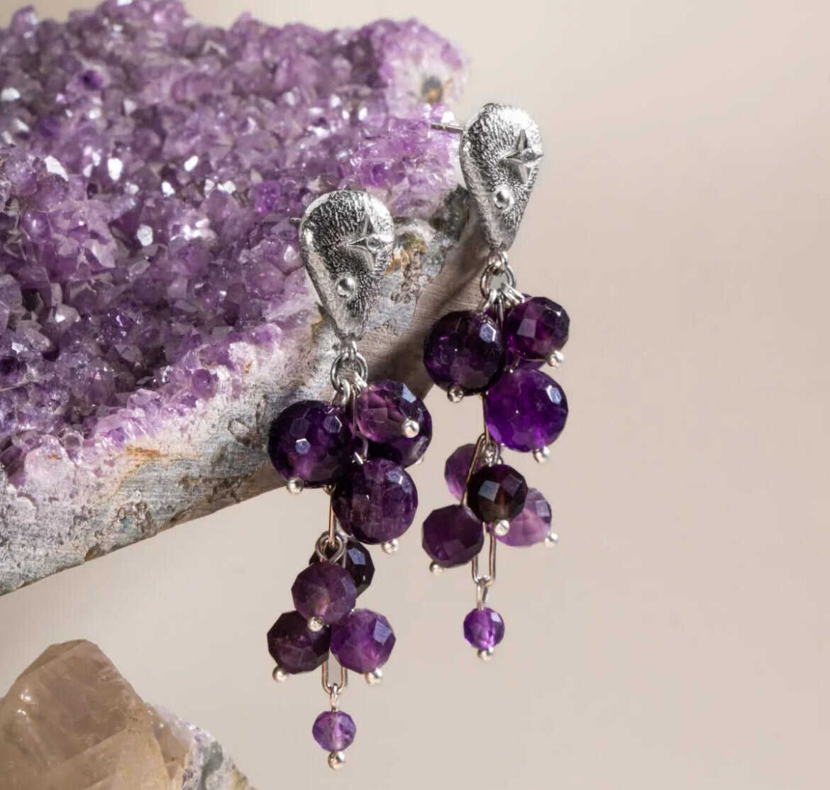 Sertifikalı Ametist Doğal Taşlı El Işçiliği Salkım Tasarım Gümüş Küpe
