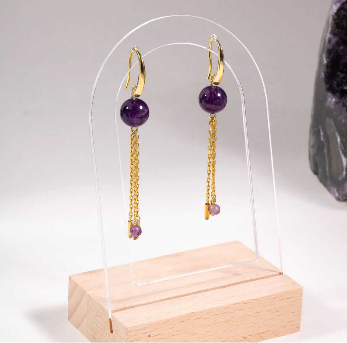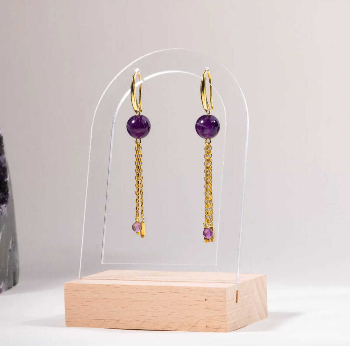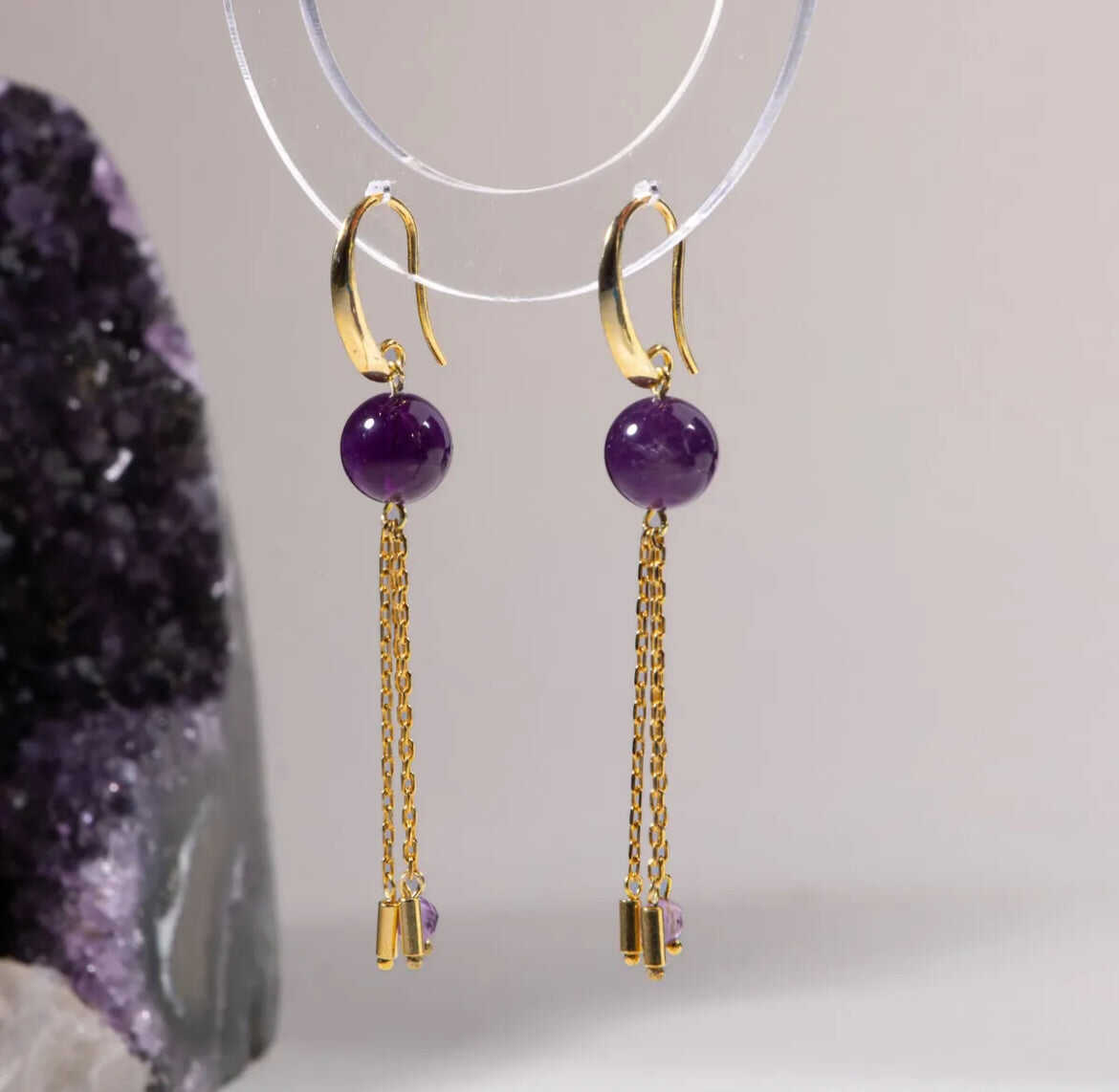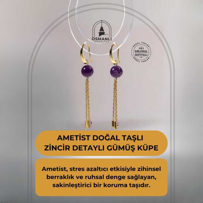 Sertifikalı Ametist Doğal Taşlı Zincir Detaylı Gümüş Küpe