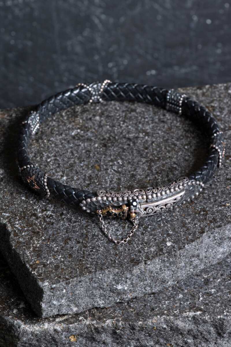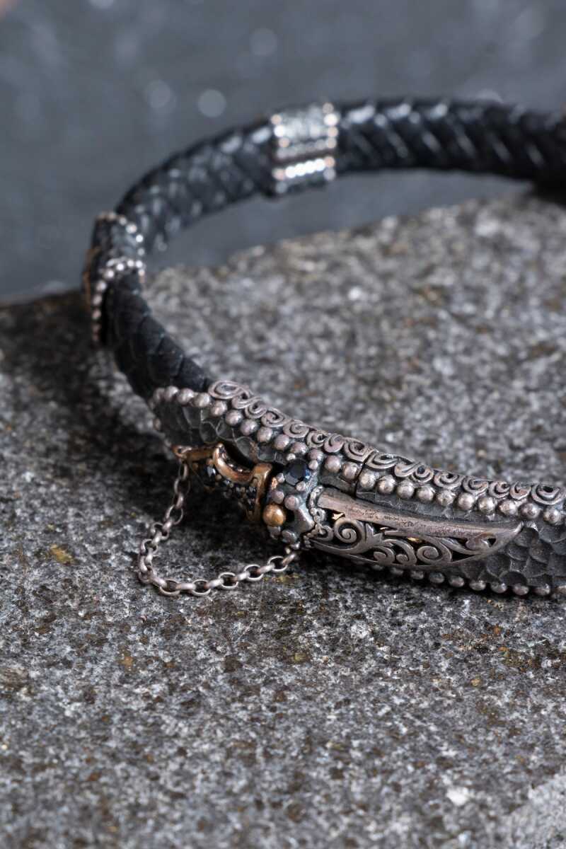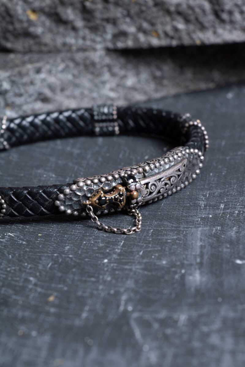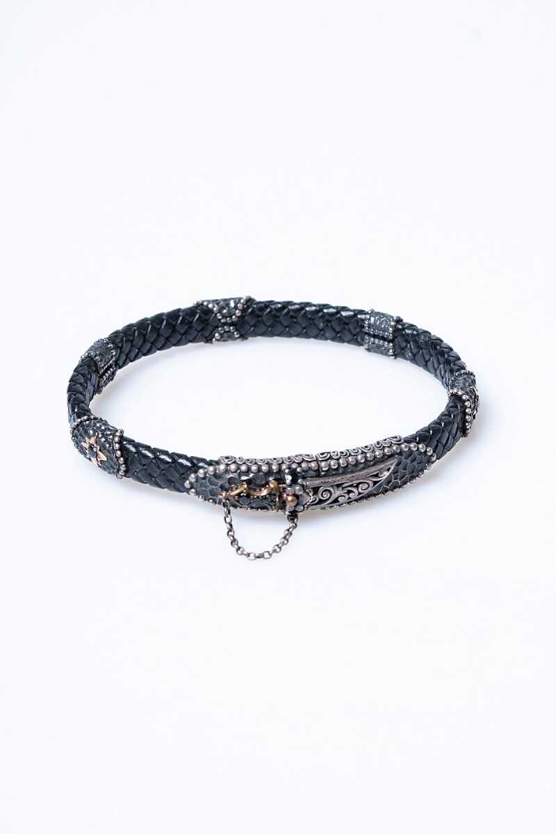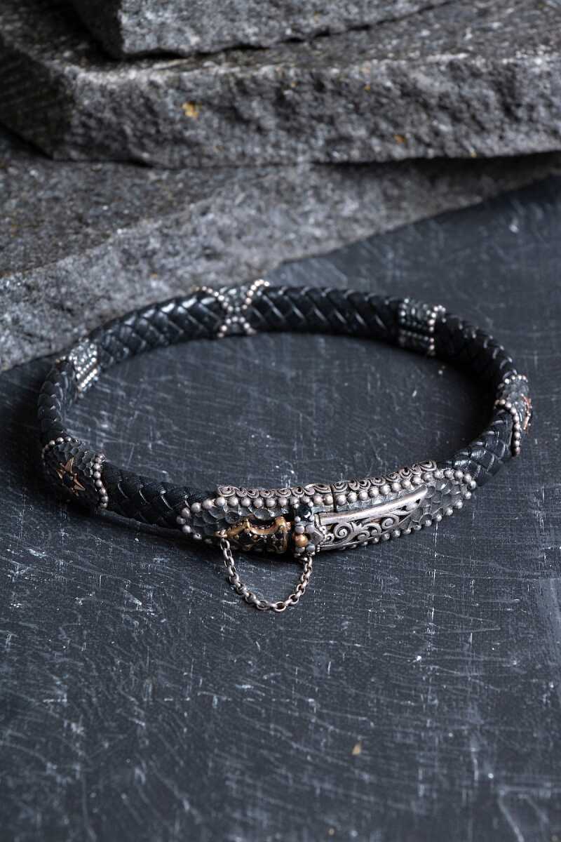 Sertifikalı El İşçiliği Gümüş Kılıç Detaylı Deri Bileklik (SK:198)