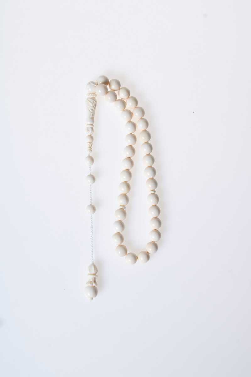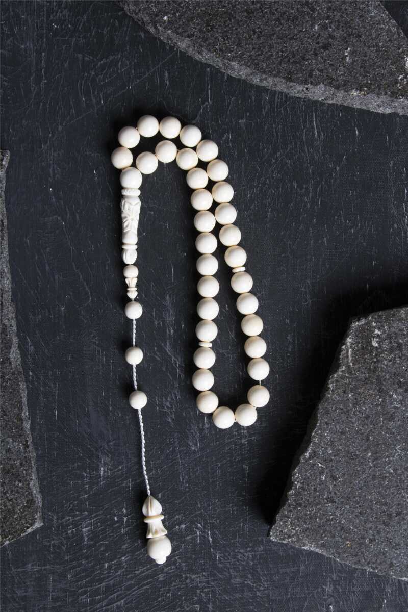 Fildişi 9 mm 33'lük Tesbih (Yaklaşık 40 gr) Zarifliği, asil duruşu ve özel dokusuyla dikkat çeken Fildişi malzemenin eşsiz hissiyle tanışın. 9 mm tane büyüklüğünde, yaklaşık 40 gram ağırlığındaki bu özel 33'lük Tesbih, şıklık, konfor ve otantik bir his arayanlar için tasarlandı. Özel Dokunun ve Kullanımın Büyüleyici Özellikleri Mükemmel Dokunma Hissi: Fildişini andıran pürüzsüz ve kadifemsi yüzeyi sayesinde elinizde kayar ve keyifli bir çekim deneyimi sunar. İdeal Ağırlık ve Boyut: Yaklaşık 40 gram civarındaki dengeli ağırlığı ve 9 mm tane boyutu ile ne çok hafif ne de çok ağırdır; günlük kullanım ve zikir için idealdir. Asil ve Zamansız Görünüm: Malzemenin krem-beyaz tonları ve doğal görünümü, tesbihe otantik ve asil bir hava katarak klasik bir şıklık sunar. 33'lük Pratik Form: Günlük zikirler, tesbihatlar ve odaklanma egzersizleri için özel olarak tasarlanmış 33'lük formu, kolay taşıma ve kullanım sağlar. Bu özel tesbih, fildişinin estetiğini yansıtan malzemeden özenle üretilmiştir ve klasik tesbih yapısına uygun bir imame ile tamamlanmıştır. Malzemenin doğal tonları ve dokusu, tesbihin değerini ve manevi havasını artırır.