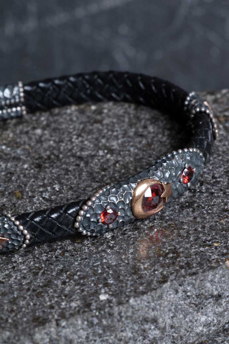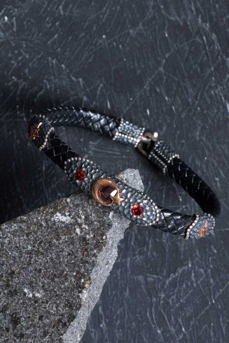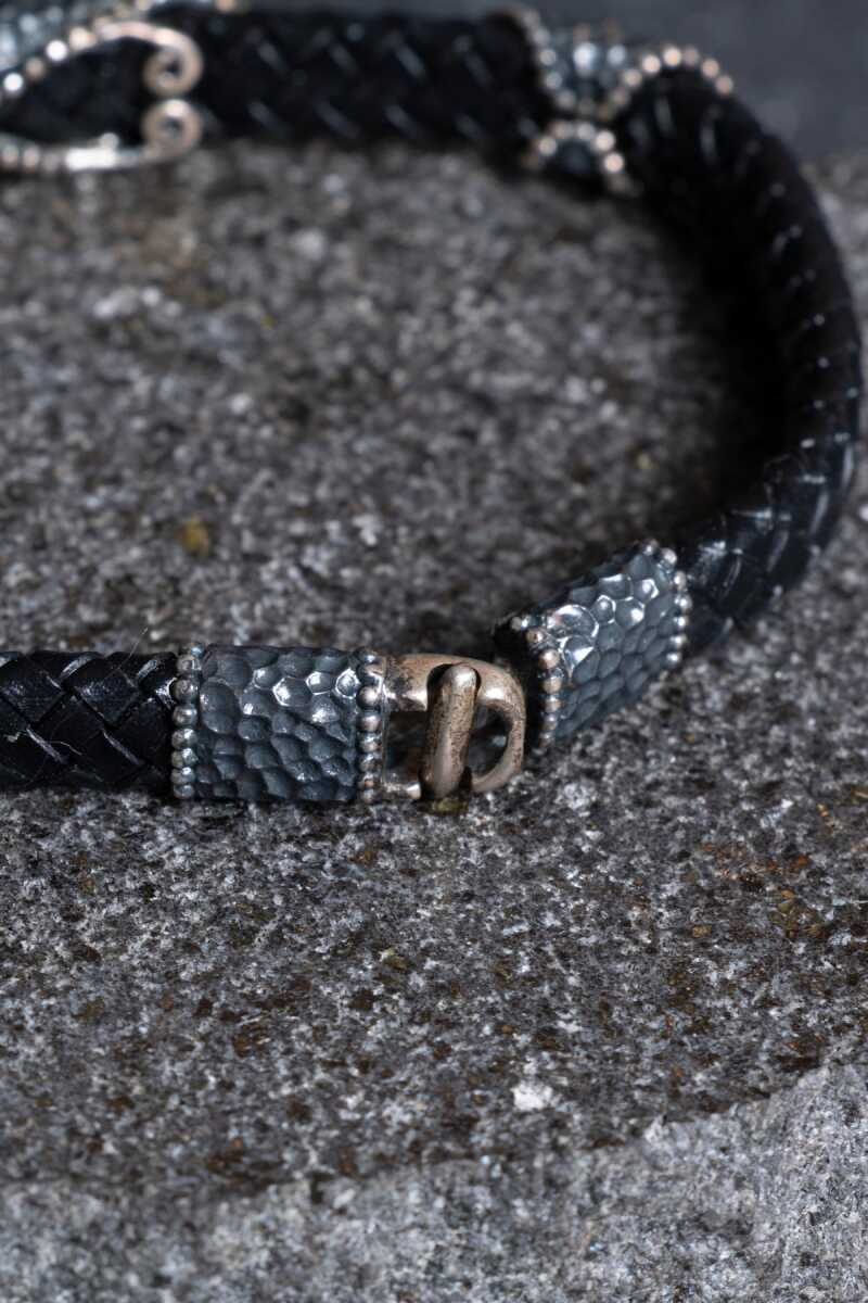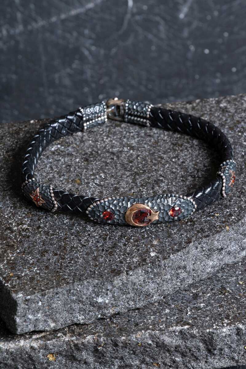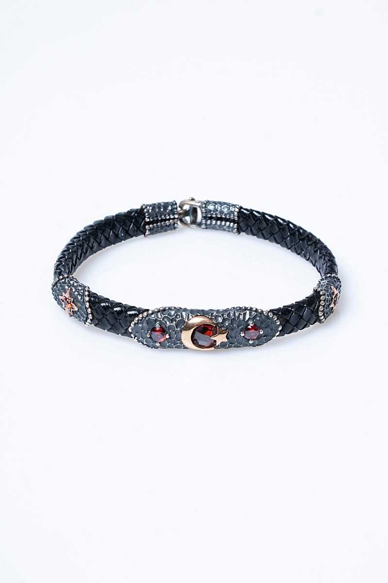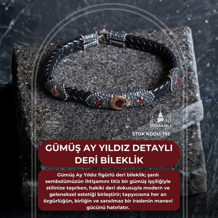 Sertifikalı Gümüş Ay Yıldız Detaylı Deri Bileklik (SK:195)