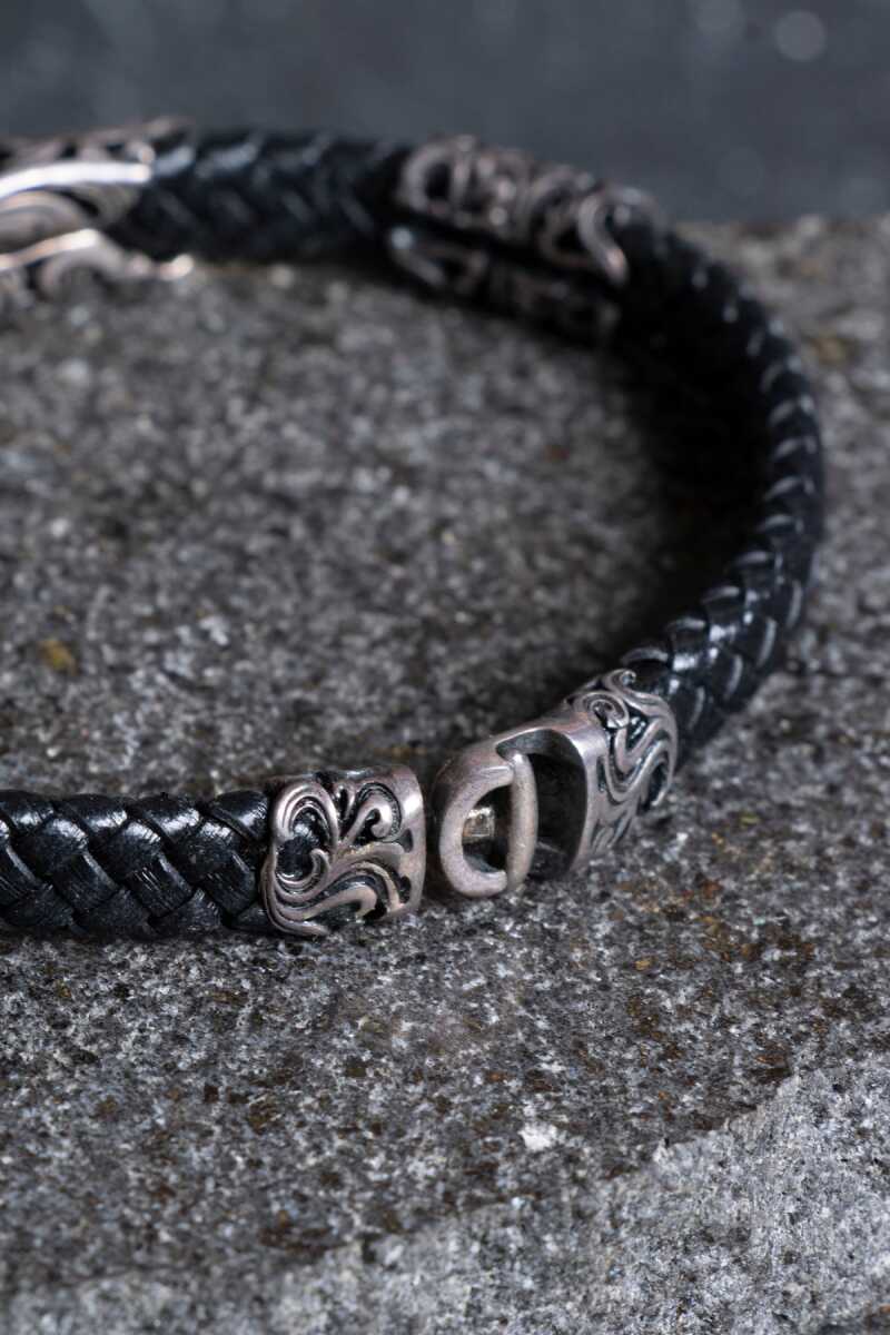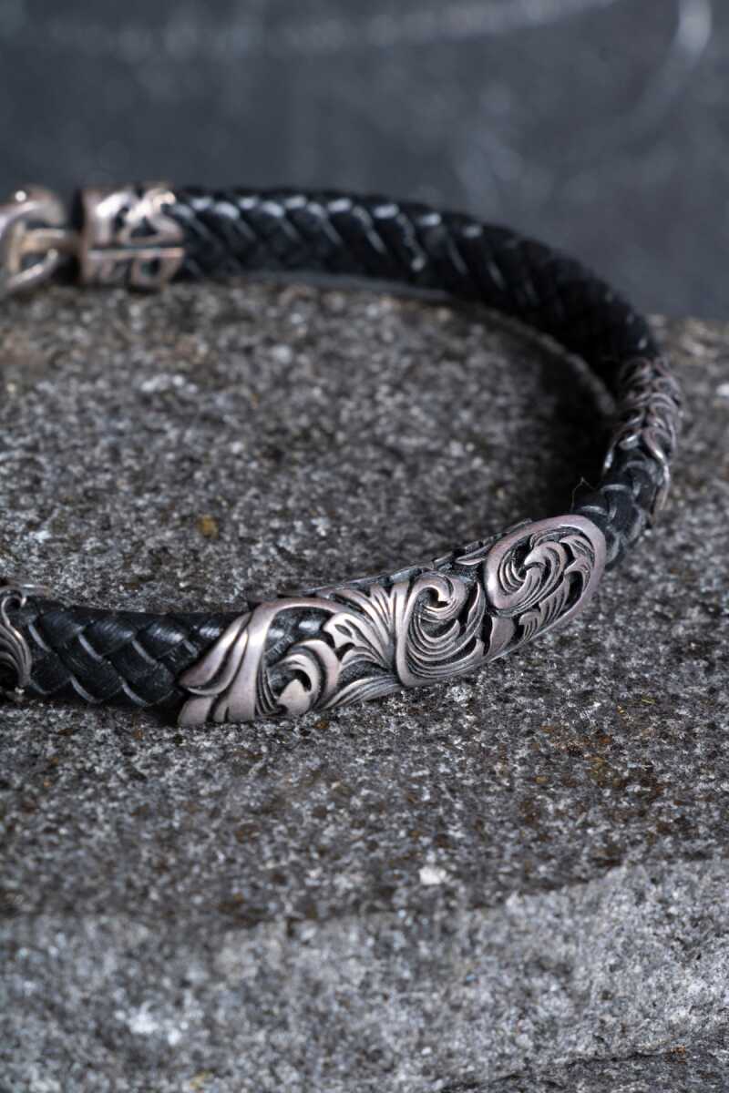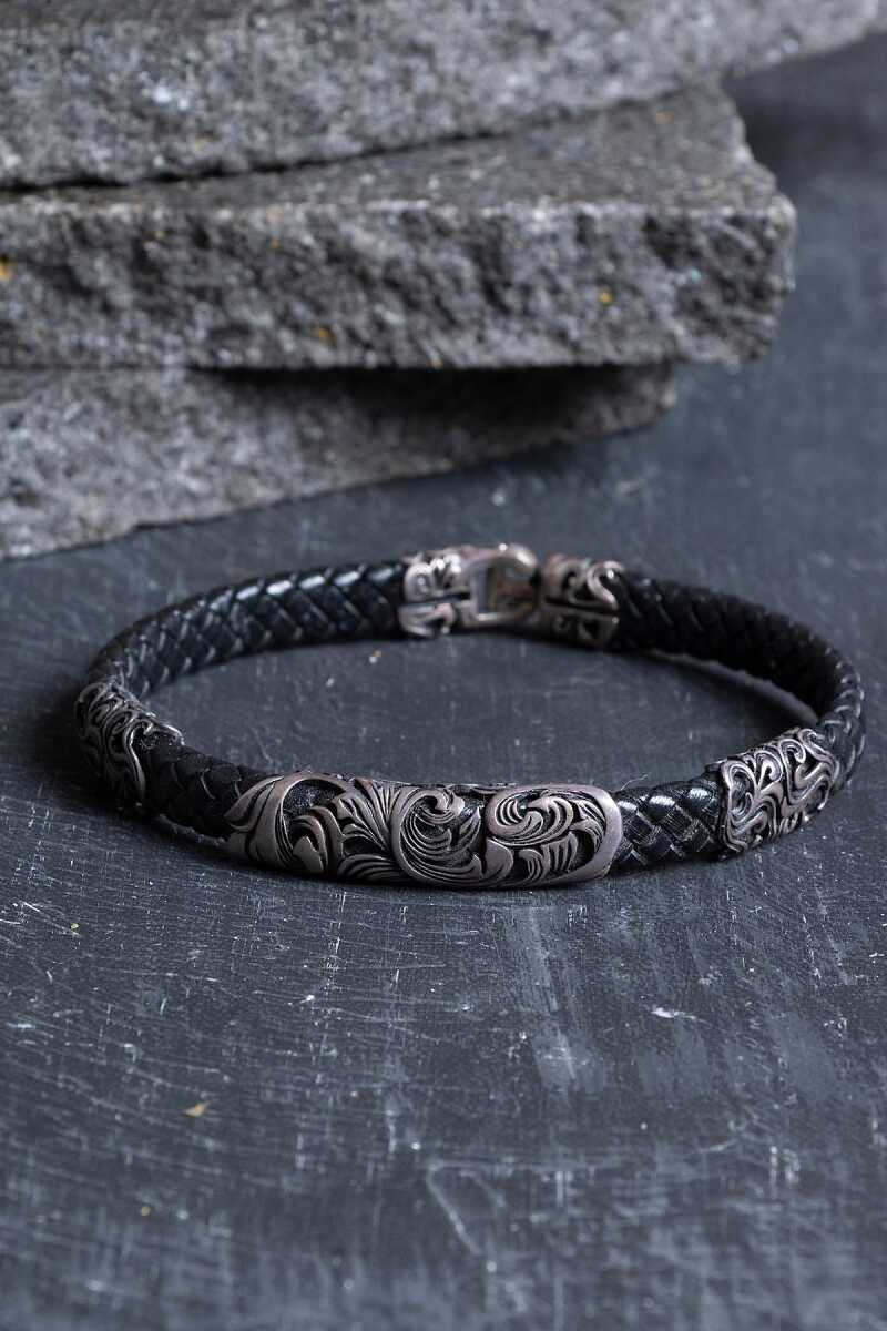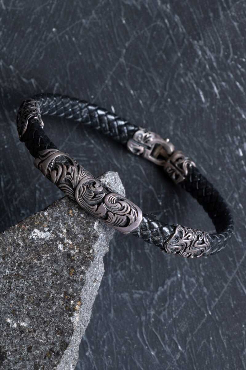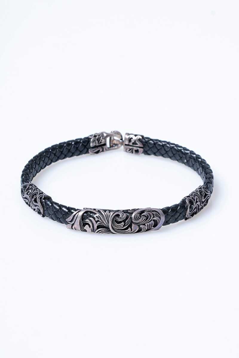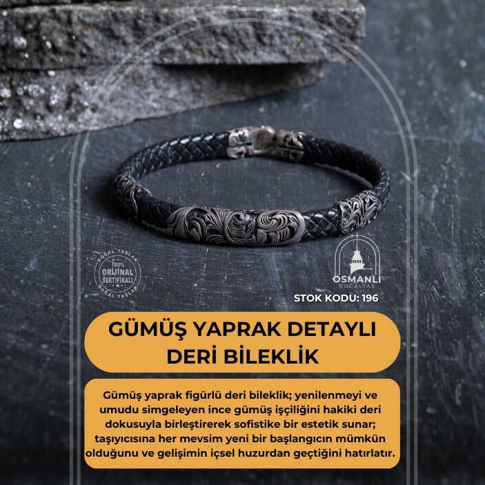 Sertifikalı Gümüş Yaprak Detaylı Deri Bileklik (SK:196)