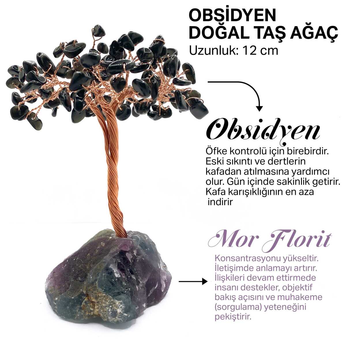 Sertifikalı Hakiki Orijinal Doğal Taş Obsidyen Ağaç - Alt Kısmı Mor Florit