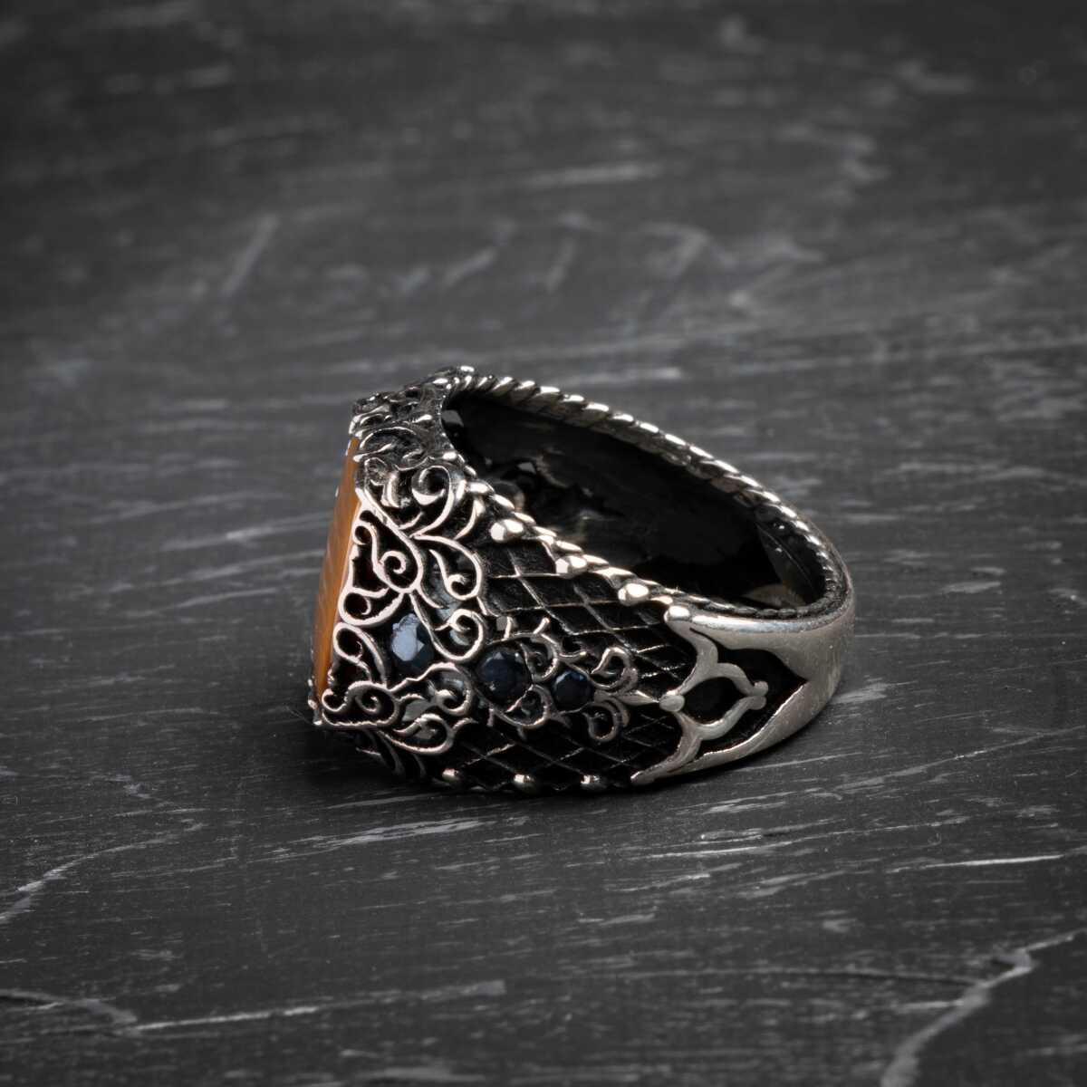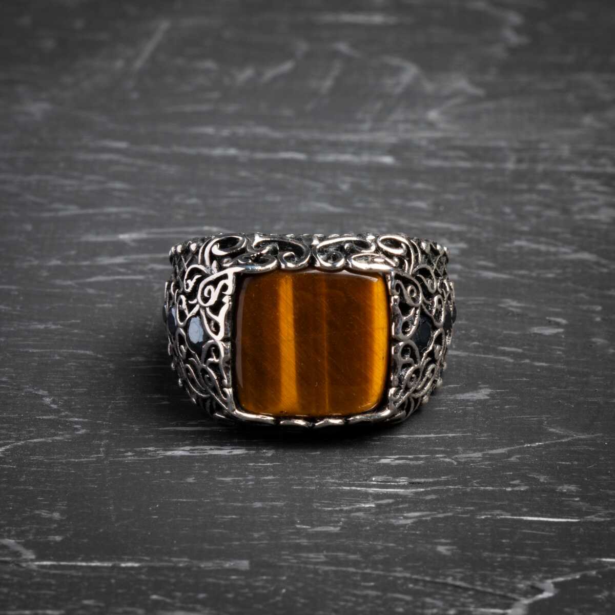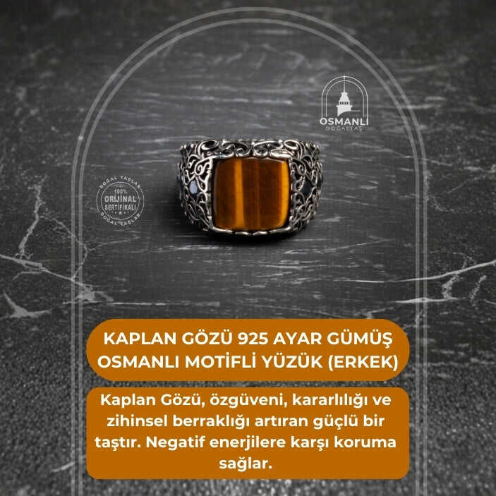 Sertifikalı Kaplan Gözü 925 Ayar Gümüş Osmanlı Motifli Yüzük (Erkek)
