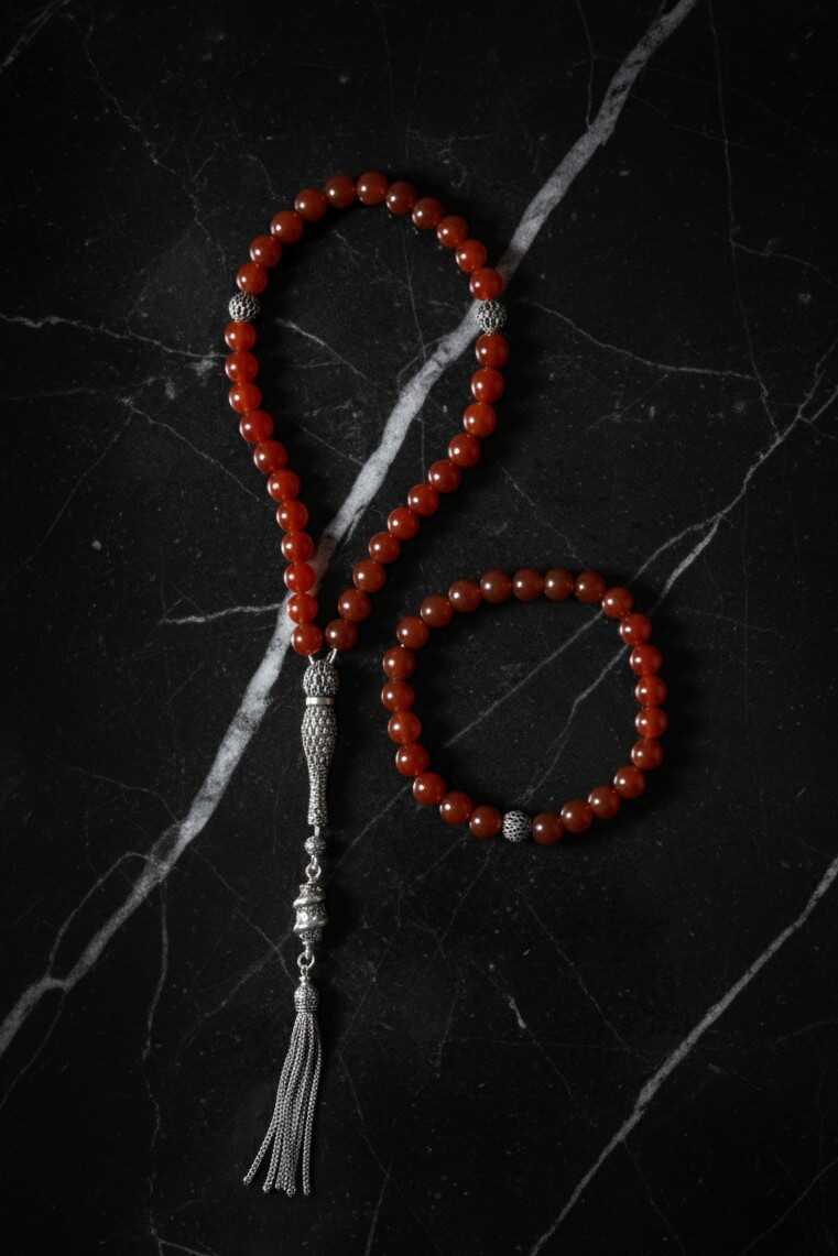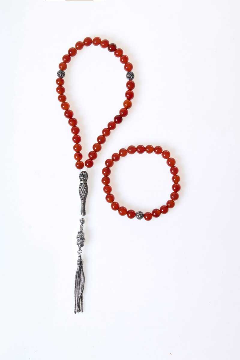 Sertifikalı Kırmızı Akik 925 Ayar Gümüş 8 mm İmameli Tesbih & Bileklik Seti Yaşam enerjisi, cesaret ve koruma gücünü taşıyan Kırmızı Akik doğal taşı ile tanışın. Zarif 925 Ayar Gümüş detaylarıyla tamamlanan Sertifikalı Kırmızı Akik Tesbih & Bileklik Seti, hem göz alıcı bir aksesuar hem de ruhsal denge ve canlılık sağlayan özel bir obje olarak hayatınıza güç katacak. Kırmızı Akik Taşının Büyüleyici Faydaları Yaşam Enerjisi ve Canlılık: Kırmızı Akik, güçlü bir enerji taşıdır. Fiziksel canlılığı ve dayanıklılığı artırır, yaşam enerjinizi yükseltir. Topraklanma ve Koruma: En bilinen koruyucu taşlardan olan Akik, özellikle kötü enerjilere ve nazara karşı kalkan görevi görür. Güçlü bir topraklanma sağlayarak denge hissinizi artırır. Cesaret ve Özgüven: Kararsızlığı giderir, cesareti ve özgüveni destekler. Hayatınızdaki zorluklarla başa çıkma gücü verir. Tutku ve Motivasyon: Harekete geçme isteğini ve tutkuyu teşvik ederek hedeflerinize ulaşmanız için motivasyon sağlar. Bu özel set, orijinalliği ve kalitesi onaylanmış gerçek Kırmızı Akik taşı kullanılarak üretilmiştir. Parlak kırmızı ve kahverengi tonlarıyla dikkat çeken bu taş, stilinize dinamik bir dokunuş katar. Her bir parça, ustalıkla işlenmiş 925 ayar gümüş imame ve detaylarla zenginleştirilmiştir. Kırmızı Akik'in doğal enerjilerinden gün boyu faydalanırken, asil görünümüyle de stilinizi tamamlayın. Şimdi sipariş verin ve Sertifikalı Kırmızı Akik 925 Ayar Gümüş Tesbih & Bileklik Seti ile hem ruhunuzu hem de stilinizi güçlendirmeye başlayın.