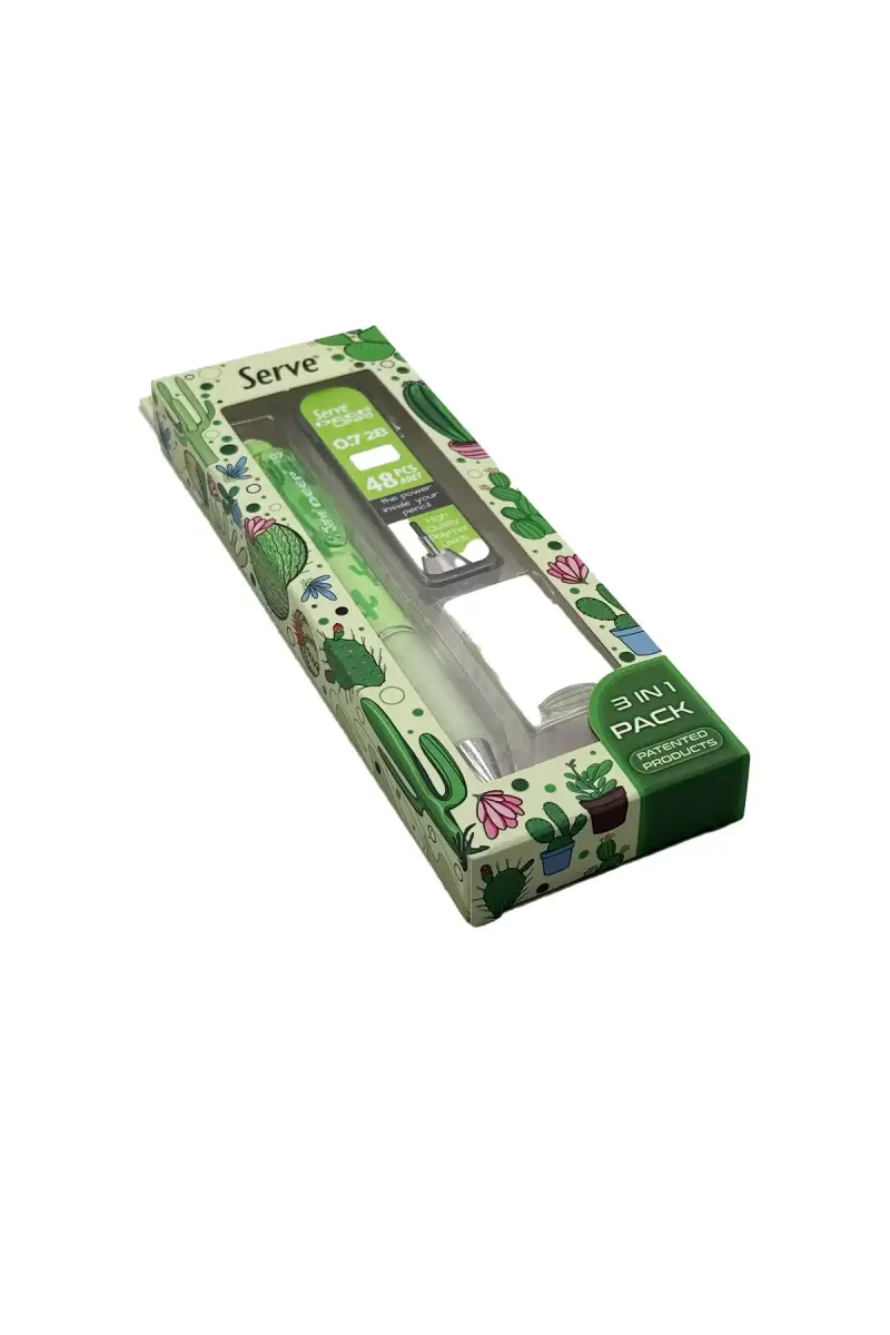 Serve Deep Doğa Desenli Kaktüs Figürlü Yeşil Uçlu Kalem + Uç + Silgi 0.7mm 3 Lü Set