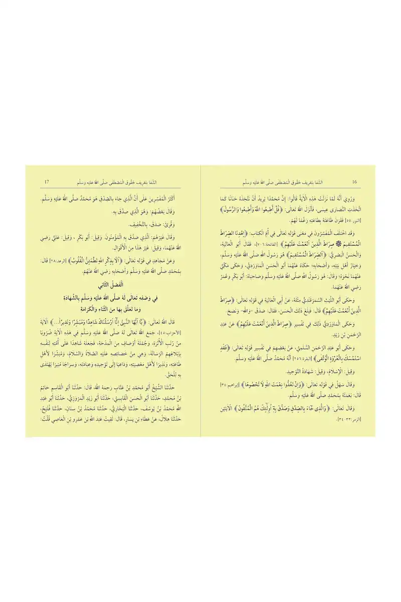 Müellif kadı Iyaz (r.aleyh) eserinde konuların evvelinde ayeti kerimeler ve hadisi şerifler zikretmiştir. Bunlarla zikredeceği konulara delil getirmiş olur. Ayrıca müfessirlerin açıklamalarını da zikrederek ayetlere nasıl mana verilmesi gerektiğini de tenbih etmiş olmaktadır.